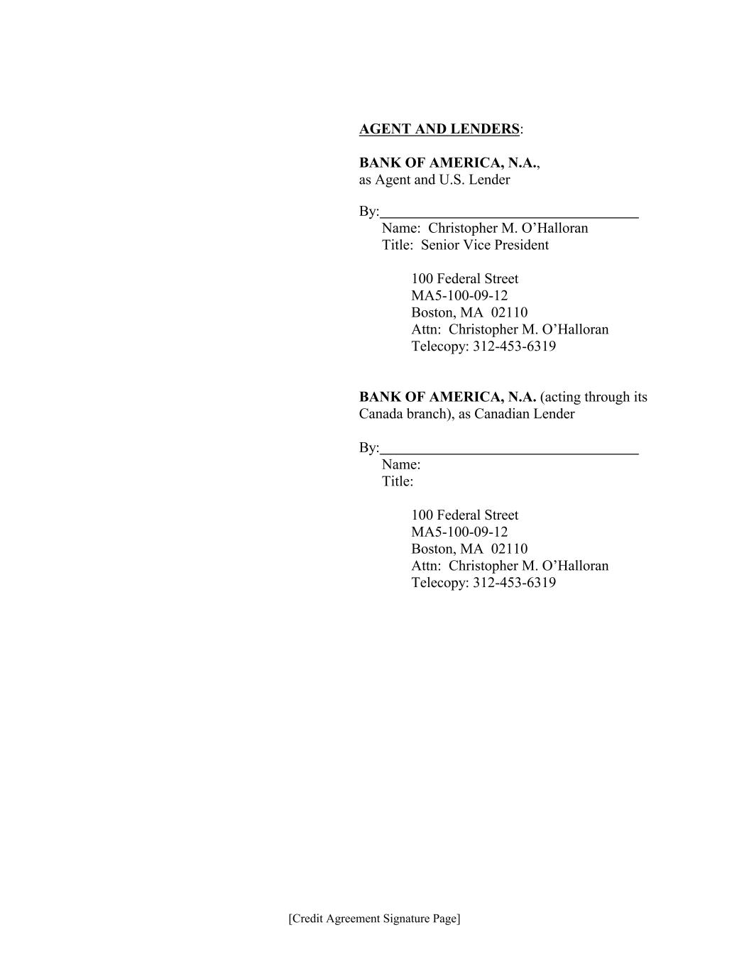 [Credit Agreement Signature Page] AGENT AND LENDERS: BANK OF AMERICA, N.A., as Agent and U.S. Lender By: Name: Christopher M. O’Halloran Title: Senior Vice President 100 Federal Street MA5-100-09-12 Boston, MA 02110 Attn: Christopher M. O’Halloran Telecopy: 312-453-6319 BANK OF AMERICA, N.A. (acting through its Canada branch), as Canadian Lender By: Name: Title: 100 Federal Street MA5-100-09-12 Boston, MA 02110 Attn: Christopher M. O’Halloran Telecopy: 312-453-6319