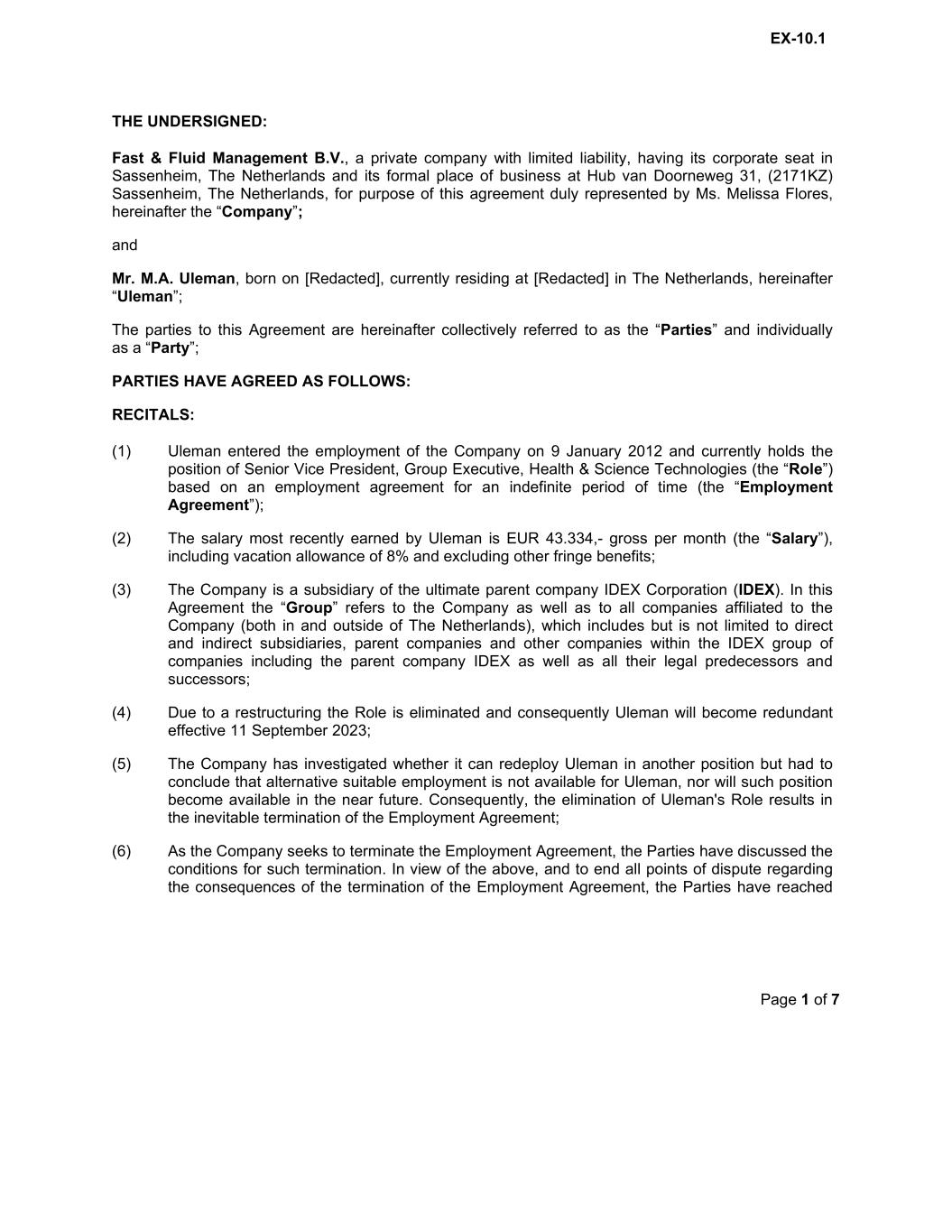Page 1 of 7 THE UNDERSIGNED: Fast & Fluid Management B.V., a private company with limited liability, having its corporate seat in Sassenheim, The Netherlands and its formal place of business at Hub van Doorneweg 31, (2171KZ) Sassenheim, The Netherlands, for purpose of this agreement duly represented by Ms. Melissa Flores, hereinafter the “Company”; and Mr. M.A. Uleman, born on [Redacted], currently residing at [Redacted] in The Netherlands, hereinafter “Uleman”; The parties to this Agreement are hereinafter collectively referred to as the “Parties” and individually as a “Party”; PARTIES HAVE AGREED AS FOLLOWS: RECITALS: (1) Uleman entered the employment of the Company on 9 January 2012 and currently holds the position of Senior Vice President, Group Executive, Health & Science Technologies (the “Role”) based on an employment agreement for an indefinite period of time (the “Employment Agreement”); (2) The salary most recently earned by Uleman is EUR 43.334,- gross per month (the “Salary”), including vacation allowance of 8% and excluding other fringe benefits; (3) The Company is a subsidiary of the ultimate parent company IDEX Corporation (IDEX). In this Agreement the “Group” refers to the Company as well as to all companies affiliated to the Company (both in and outside of The Netherlands), which includes but is not limited to direct and indirect subsidiaries, parent companies and other companies within the IDEX group of companies including the parent company IDEX as well as all their legal predecessors and successors; (4) Due to a restructuring the Role is eliminated and consequently Uleman will become redundant effective 11 September 2023; (5) The Company has investigated whether it can redeploy Uleman in another position but had to conclude that alternative suitable employment is not available for Uleman, nor will such position become available in the near future. Consequently, the elimination of Uleman's Role results in the inevitable termination of the Employment Agreement; (6) As the Company seeks to terminate the Employment Agreement, the Parties have discussed the conditions for such termination. In view of the above, and to end all points of dispute regarding the consequences of the termination of the Employment Agreement, the Parties have reached EX-10.1