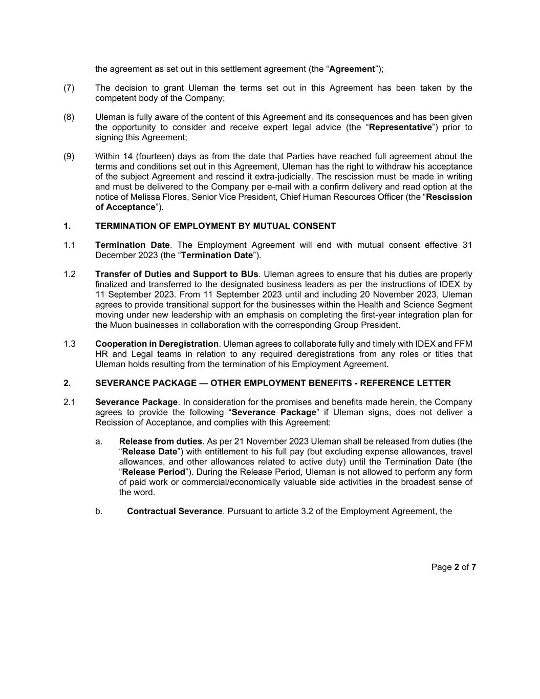 Page 2 of 7 the agreement as set out in this settlement agreement (the “Agreement”); (7) The decision to grant Uleman the terms set out in this Agreement has been taken by the competent body of the Company; (8) Uleman is fully aware of the content of this Agreement and its consequences and has been given the opportunity to consider and receive expert legal advice (the “Representative”) prior to signing this Agreement; (9) Within 14 (fourteen) days as from the date that Parties have reached full agreement about the terms and conditions set out in this Agreement, Uleman has the right to withdraw his acceptance of the subject Agreement and rescind it extra-judicially. The rescission must be made in writing and must be delivered to the Company per e-mail with a confirm delivery and read option at the notice of Melissa Flores, Senior Vice President, Chief Human Resources Officer (the “Rescission of Acceptance”). 1. TERMINATION OF EMPLOYMENT BY MUTUAL CONSENT 1.1 Termination Date. The Employment Agreement will end with mutual consent effective 31 December 2023 (the “Termination Date”). 1.2 Transfer of Duties and Support to BUs. Uleman agrees to ensure that his duties are properly finalized and transferred to the designated business leaders as per the instructions of IDEX by 11 September 2023. From 11 September 2023 until and including 20 November 2023, Uleman agrees to provide transitional support for the businesses within the Health and Science Segment moving under new leadership with an emphasis on completing the first-year integration plan for the Muon businesses in collaboration with the corresponding Group President. 1.3 Cooperation in Deregistration. Uleman agrees to collaborate fully and timely with IDEX and FFM HR and Legal teams in relation to any required deregistrations from any roles or titles that Uleman holds resulting from the termination of his Employment Agreement. 2. SEVERANCE PACKAGE — OTHER EMPLOYMENT BENEFITS - REFERENCE LETTER 2.1 Severance Package. In consideration for the promises and benefits made herein, the Company agrees to provide the following “Severance Package” if Uleman signs, does not deliver a Recission of Acceptance, and complies with this Agreement: a. Release from duties. As per 21 November 2023 Uleman shall be released from duties (the “Release Date”) with entitlement to his full pay (but excluding expense allowances, travel allowances, and other allowances related to active duty) until the Termination Date (the “Release Period”). During the Release Period, Uleman is not allowed to perform any form of paid work or commercial/economically valuable side activities in the broadest sense of the word. b. Contractual Severance. Pursuant to article 3.2 of the Employment Agreement, the