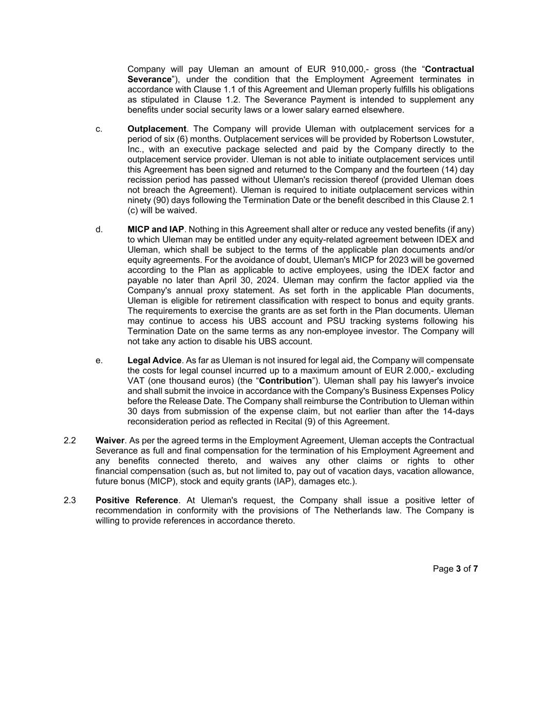 Page 3 of 7 Company will pay Uleman an amount of EUR 910,000,- gross (the “Contractual Severance”), under the condition that the Employment Agreement terminates in accordance with Clause 1.1 of this Agreement and Uleman properly fulfills his obligations as stipulated in Clause 1.2. The Severance Payment is intended to supplement any benefits under social security laws or a lower salary earned elsewhere. c. Outplacement. The Company will provide Uleman with outplacement services for a period of six (6) months. Outplacement services will be provided by Robertson Lowstuter, Inc., with an executive package selected and paid by the Company directly to the outplacement service provider. Uleman is not able to initiate outplacement services until this Agreement has been signed and returned to the Company and the fourteen (14) day recission period has passed without Uleman's recission thereof (provided Uleman does not breach the Agreement). Uleman is required to initiate outplacement services within ninety (90) days following the Termination Date or the benefit described in this Clause 2.1 (c) will be waived. d. MICP and IAP. Nothing in this Agreement shall alter or reduce any vested benefits (if any) to which Uleman may be entitled under any equity-related agreement between IDEX and Uleman, which shall be subject to the terms of the applicable plan documents and/or equity agreements. For the avoidance of doubt, Uleman's MICP for 2023 will be governed according to the Plan as applicable to active employees, using the IDEX factor and payable no later than April 30, 2024. Uleman may confirm the factor applied via the Company's annual proxy statement. As set forth in the applicable Plan documents, Uleman is eligible for retirement classification with respect to bonus and equity grants. The requirements to exercise the grants are as set forth in the Plan documents. Uleman may continue to access his UBS account and PSU tracking systems following his Termination Date on the same terms as any non-employee investor. The Company will not take any action to disable his UBS account. e. Legal Advice. As far as Uleman is not insured for legal aid, the Company will compensate the costs for legal counsel incurred up to a maximum amount of EUR 2.000,- excluding VAT (one thousand euros) (the “Contribution”). Uleman shall pay his lawyer's invoice and shall submit the invoice in accordance with the Company's Business Expenses Policy before the Release Date. The Company shall reimburse the Contribution to Uleman within 30 days from submission of the expense claim, but not earlier than after the 14-days reconsideration period as reflected in Recital (9) of this Agreement. 2.2 Waiver. As per the agreed terms in the Employment Agreement, Uleman accepts the Contractual Severance as full and final compensation for the termination of his Employment Agreement and any benefits connected thereto, and waives any other claims or rights to other financial compensation (such as, but not limited to, pay out of vacation days, vacation allowance, future bonus (MICP), stock and equity grants (IAP), damages etc.). 2.3 Positive Reference. At Uleman's request, the Company shall issue a positive letter of recommendation in conformity with the provisions of The Netherlands law. The Company is willing to provide references in accordance thereto.