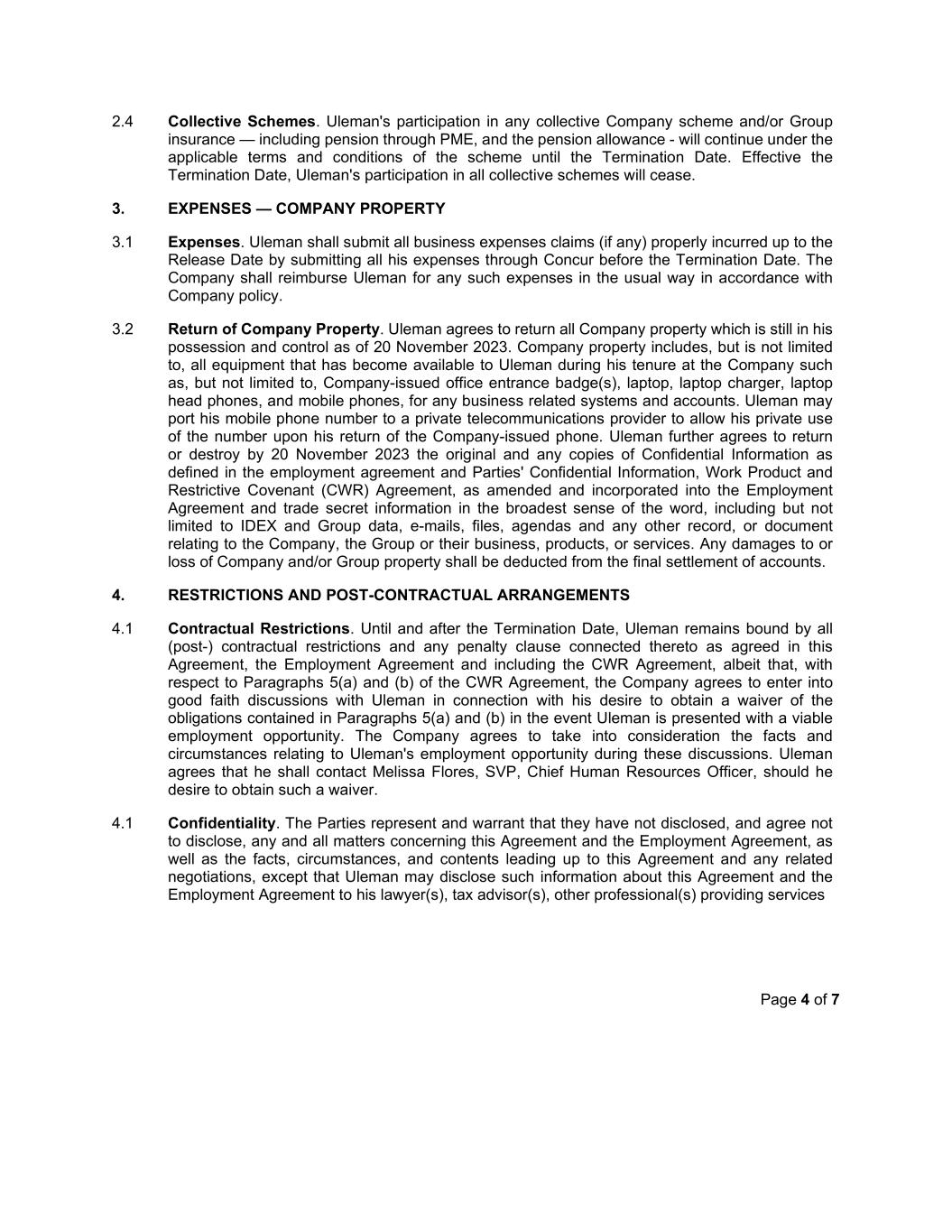 Page 4 of 7 2.4 Collective Schemes. Uleman's participation in any collective Company scheme and/or Group insurance — including pension through PME, and the pension allowance - will continue under the applicable terms and conditions of the scheme until the Termination Date. Effective the Termination Date, Uleman's participation in all collective schemes will cease. 3. EXPENSES — COMPANY PROPERTY 3.1 Expenses. Uleman shall submit all business expenses claims (if any) properly incurred up to the Release Date by submitting all his expenses through Concur before the Termination Date. The Company shall reimburse Uleman for any such expenses in the usual way in accordance with Company policy. 3.2 Return of Company Property. Uleman agrees to return all Company property which is still in his possession and control as of 20 November 2023. Company property includes, but is not limited to, all equipment that has become available to Uleman during his tenure at the Company such as, but not limited to, Company-issued office entrance badge(s), laptop, laptop charger, laptop head phones, and mobile phones, for any business related systems and accounts. Uleman may port his mobile phone number to a private telecommunications provider to allow his private use of the number upon his return of the Company-issued phone. Uleman further agrees to return or destroy by 20 November 2023 the original and any copies of Confidential Information as defined in the employment agreement and Parties' Confidential Information, Work Product and Restrictive Covenant (CWR) Agreement, as amended and incorporated into the Employment Agreement and trade secret information in the broadest sense of the word, including but not limited to IDEX and Group data, e-mails, files, agendas and any other record, or document relating to the Company, the Group or their business, products, or services. Any damages to or loss of Company and/or Group property shall be deducted from the final settlement of accounts. 4. RESTRICTIONS AND POST-CONTRACTUAL ARRANGEMENTS 4.1 Contractual Restrictions. Until and after the Termination Date, Uleman remains bound by all (post-) contractual restrictions and any penalty clause connected thereto as agreed in this Agreement, the Employment Agreement and including the CWR Agreement, albeit that, with respect to Paragraphs 5(a) and (b) of the CWR Agreement, the Company agrees to enter into good faith discussions with Uleman in connection with his desire to obtain a waiver of the obligations contained in Paragraphs 5(a) and (b) in the event Uleman is presented with a viable employment opportunity. The Company agrees to take into consideration the facts and circumstances relating to Uleman's employment opportunity during these discussions. Uleman agrees that he shall contact Melissa Flores, SVP, Chief Human Resources Officer, should he desire to obtain such a waiver. 4.1 Confidentiality. The Parties represent and warrant that they have not disclosed, and agree not to disclose, any and all matters concerning this Agreement and the Employment Agreement, as well as the facts, circumstances, and contents leading up to this Agreement and any related negotiations, except that Uleman may disclose such information about this Agreement and the Employment Agreement to his lawyer(s), tax advisor(s), other professional(s) providing services