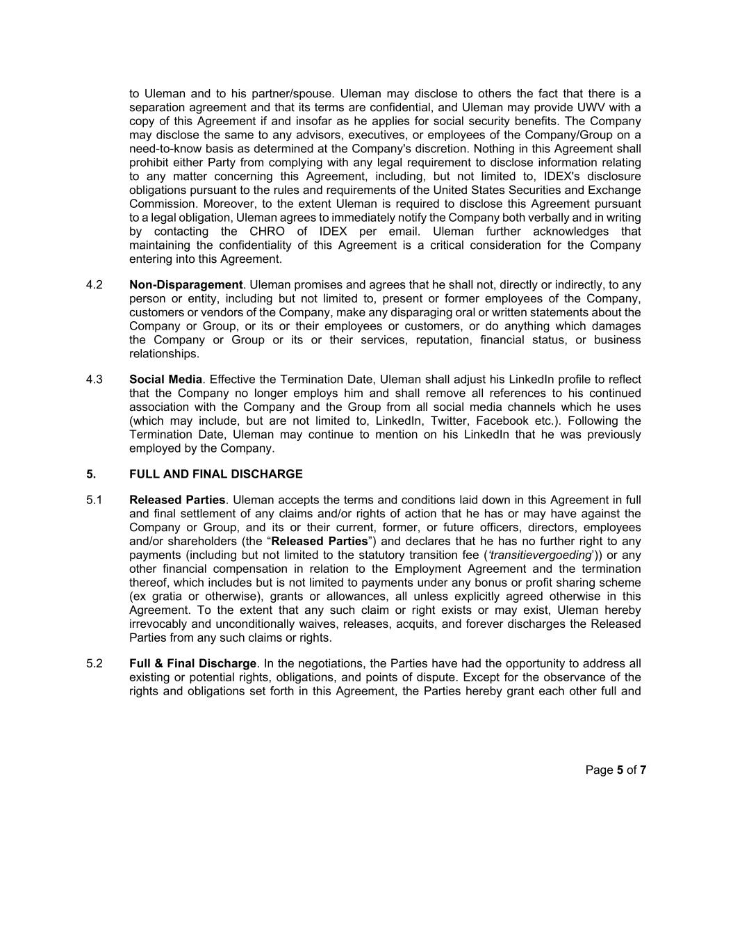 Page 5 of 7 to Uleman and to his partner/spouse. Uleman may disclose to others the fact that there is a separation agreement and that its terms are confidential, and Uleman may provide UWV with a copy of this Agreement if and insofar as he applies for social security benefits. The Company may disclose the same to any advisors, executives, or employees of the Company/Group on a need-to-know basis as determined at the Company's discretion. Nothing in this Agreement shall prohibit either Party from complying with any legal requirement to disclose information relating to any matter concerning this Agreement, including, but not limited to, IDEX's disclosure obligations pursuant to the rules and requirements of the United States Securities and Exchange Commission. Moreover, to the extent Uleman is required to disclose this Agreement pursuant to a legal obligation, Uleman agrees to immediately notify the Company both verbally and in writing by contacting the CHRO of IDEX per email. Uleman further acknowledges that maintaining the confidentiality of this Agreement is a critical consideration for the Company entering into this Agreement. 4.2 Non-Disparagement. Uleman promises and agrees that he shall not, directly or indirectly, to any person or entity, including but not limited to, present or former employees of the Company, customers or vendors of the Company, make any disparaging oral or written statements about the Company or Group, or its or their employees or customers, or do anything which damages the Company or Group or its or their services, reputation, financial status, or business relationships. 4.3 Social Media. Effective the Termination Date, Uleman shall adjust his LinkedIn profile to reflect that the Company no longer employs him and shall remove all references to his continued association with the Company and the Group from all social media channels which he uses (which may include, but are not limited to, LinkedIn, Twitter, Facebook etc.). Following the Termination Date, Uleman may continue to mention on his LinkedIn that he was previously employed by the Company. 5. FULL AND FINAL DISCHARGE 5.1 Released Parties. Uleman accepts the terms and conditions laid down in this Agreement in full and final settlement of any claims and/or rights of action that he has or may have against the Company or Group, and its or their current, former, or future officers, directors, employees and/or shareholders (the “Released Parties”) and declares that he has no further right to any payments (including but not limited to the statutory transition fee (‘transitievergoeding’)) or any other financial compensation in relation to the Employment Agreement and the termination thereof, which includes but is not limited to payments under any bonus or profit sharing scheme (ex gratia or otherwise), grants or allowances, all unless explicitly agreed otherwise in this Agreement. To the extent that any such claim or right exists or may exist, Uleman hereby irrevocably and unconditionally waives, releases, acquits, and forever discharges the Released Parties from any such claims or rights. 5.2 Full & Final Discharge. In the negotiations, the Parties have had the opportunity to address all existing or potential rights, obligations, and points of dispute. Except for the observance of the rights and obligations set forth in this Agreement, the Parties hereby grant each other full and