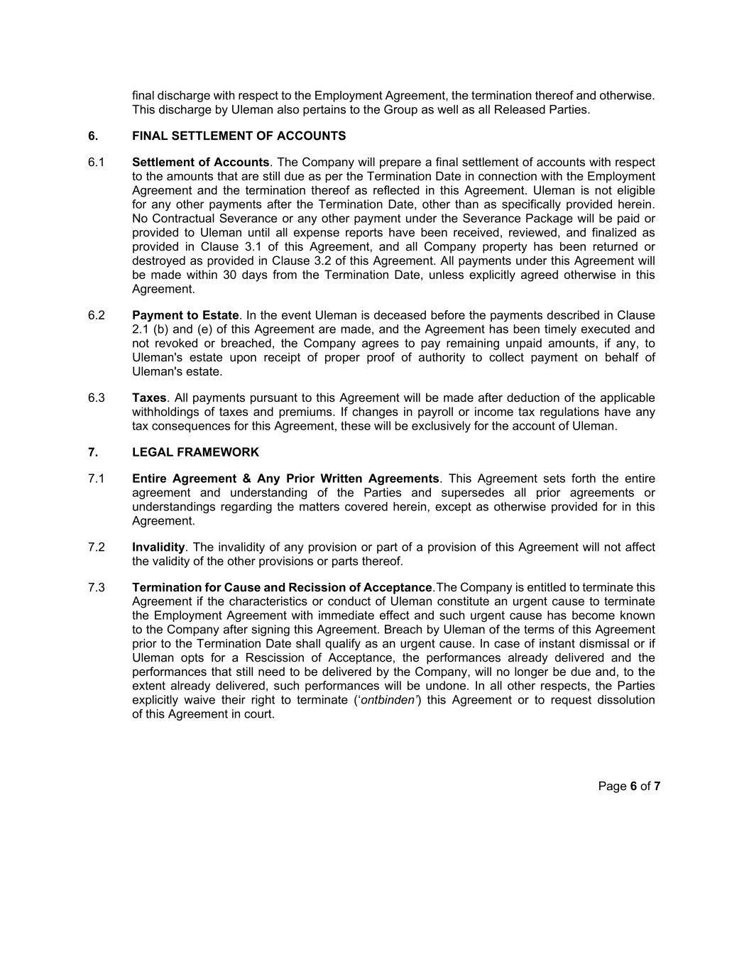 Page 6 of 7 final discharge with respect to the Employment Agreement, the termination thereof and otherwise. This discharge by Uleman also pertains to the Group as well as all Released Parties. 6. FINAL SETTLEMENT OF ACCOUNTS 6.1 Settlement of Accounts. The Company will prepare a final settlement of accounts with respect to the amounts that are still due as per the Termination Date in connection with the Employment Agreement and the termination thereof as reflected in this Agreement. Uleman is not eligible for any other payments after the Termination Date, other than as specifically provided herein. No Contractual Severance or any other payment under the Severance Package will be paid or provided to Uleman until all expense reports have been received, reviewed, and finalized as provided in Clause 3.1 of this Agreement, and all Company property has been returned or destroyed as provided in Clause 3.2 of this Agreement. All payments under this Agreement will be made within 30 days from the Termination Date, unless explicitly agreed otherwise in this Agreement. 6.2 Payment to Estate. In the event Uleman is deceased before the payments described in Clause 2.1 (b) and (e) of this Agreement are made, and the Agreement has been timely executed and not revoked or breached, the Company agrees to pay remaining unpaid amounts, if any, to Uleman's estate upon receipt of proper proof of authority to collect payment on behalf of Uleman's estate. 6.3 Taxes. All payments pursuant to this Agreement will be made after deduction of the applicable withholdings of taxes and premiums. If changes in payroll or income tax regulations have any tax consequences for this Agreement, these will be exclusively for the account of Uleman. 7. LEGAL FRAMEWORK 7.1 Entire Agreement & Any Prior Written Agreements. This Agreement sets forth the entire agreement and understanding of the Parties and supersedes all prior agreements or understandings regarding the matters covered herein, except as otherwise provided for in this Agreement. 7.2 Invalidity. The invalidity of any provision or part of a provision of this Agreement will not affect the validity of the other provisions or parts thereof. 7.3 Termination for Cause and Recission of Acceptance. The Company is entitled to terminate this Agreement if the characteristics or conduct of Uleman constitute an urgent cause to terminate the Employment Agreement with immediate effect and such urgent cause has become known to the Company after signing this Agreement. Breach by Uleman of the terms of this Agreement prior to the Termination Date shall qualify as an urgent cause. In case of instant dismissal or if Uleman opts for a Rescission of Acceptance, the performances already delivered and the performances that still need to be delivered by the Company, will no longer be due and, to the extent already delivered, such performances will be undone. In all other respects, the Parties explicitly waive their right to terminate (‘ontbinden’) this Agreement or to request dissolution of this Agreement in court.