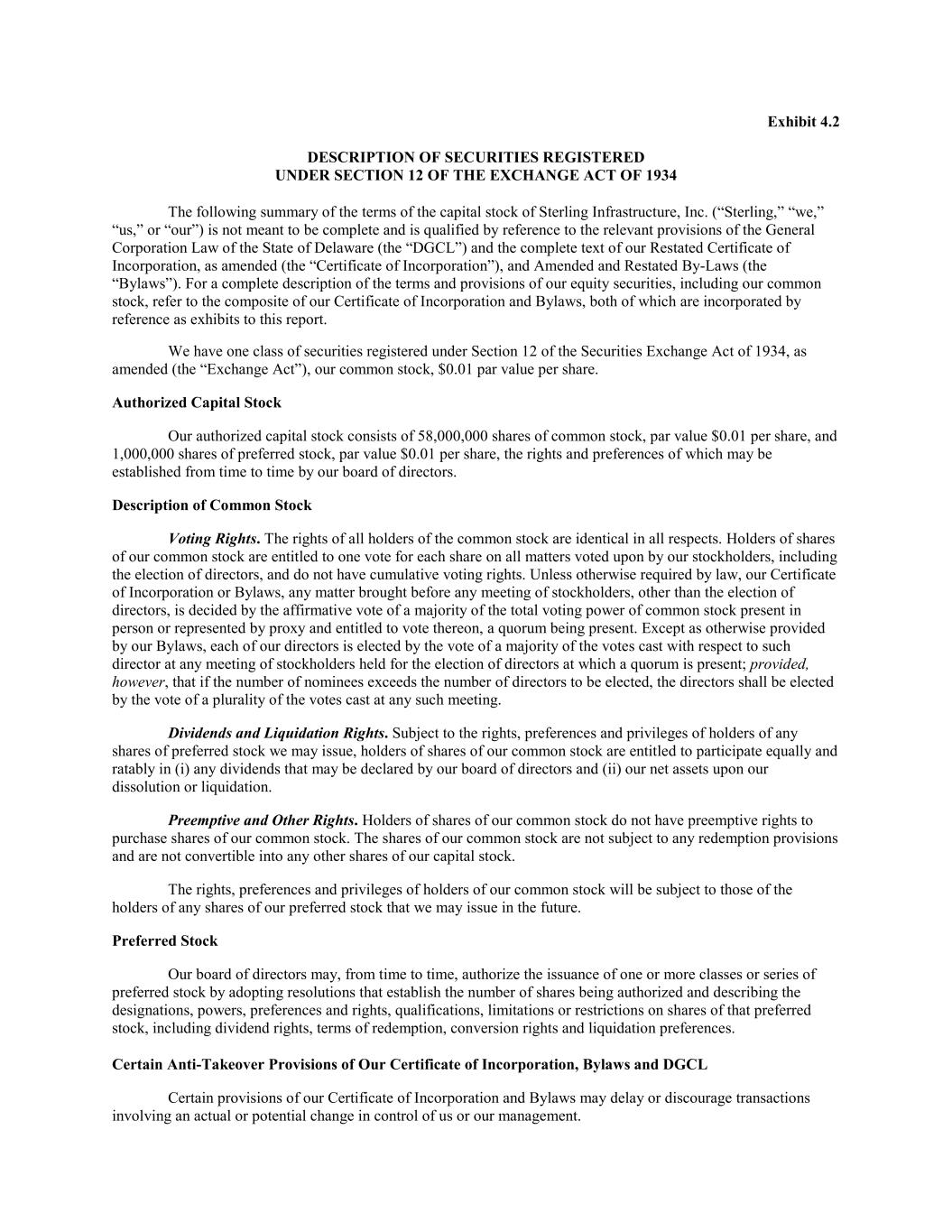 #101202926v3 Exhibit 4.2 DESCRIPTION OF SECURITIES REGISTERED UNDER SECTION 12 OF THE EXCHANGE ACT OF 1934 The following summary of the terms of the capital stock of Sterling Infrastructure, Inc. (“Sterling,” “we,” “us,” or “our”) is not meant to be complete and is qualified by reference to the relevant provisions of the General Corporation Law of the State of Delaware (the “DGCL”) and the complete text of our Restated Certificate of Incorporation, as amended (the “Certificate of Incorporation”), and Amended and Restated By-Laws (the “Bylaws”). For a complete description of the terms and provisions of our equity securities, including our common stock, refer to the composite of our Certificate of Incorporation and Bylaws, both of which are incorporated by reference as exhibits to this report. We have one class of securities registered under Section 12 of the Securities Exchange Act of 1934, as amended (the “Exchange Act”), our common stock, $0.01 par value per share. Authorized Capital Stock Our authorized capital stock consists of 58,000,000 shares of common stock, par value $0.01 per share, and 1,000,000 shares of preferred stock, par value $0.01 per share, the rights and preferences of which may be established from time to time by our board of directors. Description of Common Stock Voting Rights. The rights of all holders of the common stock are identical in all respects. Holders of shares of our common stock are entitled to one vote for each share on all matters voted upon by our stockholders, including the election of directors, and do not have cumulative voting rights. Unless otherwise required by law, our Certificate of Incorporation or Bylaws, any matter brought before any meeting of stockholders, other than the election of directors, is decided by the affirmative vote of a majority of the total voting power of common stock present in person or represented by proxy and entitled to vote thereon, a quorum being present. Except as otherwise provided by our Bylaws, each of our directors is elected by the vote of a majority of the votes cast with respect to such director at any meeting of stockholders held for the election of directors at which a quorum is present; provided, however, that if the number of nominees exceeds the number of directors to be elected, the directors shall be elected by the vote of a plurality of the votes cast at any such meeting. Dividends and Liquidation Rights. Subject to the rights, preferences and privileges of holders of any shares of preferred stock we may issue, holders of shares of our common stock are entitled to participate equally and ratably in (i) any dividends that may be declared by our board of directors and (ii) our net assets upon our dissolution or liquidation. Preemptive and Other Rights. Holders of shares of our common stock do not have preemptive rights to purchase shares of our common stock. The shares of our common stock are not subject to any redemption provisions and are not convertible into any other shares of our capital stock. The rights, preferences and privileges of holders of our common stock will be subject to those of the holders of any shares of our preferred stock that we may issue in the future. Preferred Stock Our board of directors may, from time to time, authorize the issuance of one or more classes or series of preferred stock by adopting resolutions that establish the number of shares being authorized and describing the designations, powers, preferences and rights, qualifications, limitations or restrictions on shares of that preferred stock, including dividend rights, terms of redemption, conversion rights and liquidation preferences. Certain Anti-Takeover Provisions of Our Certificate of Incorporation, Bylaws and DGCL Certain provisions of our Certificate of Incorporation and Bylaws may delay or discourage transactions involving an actual or potential change in control of us or our management.