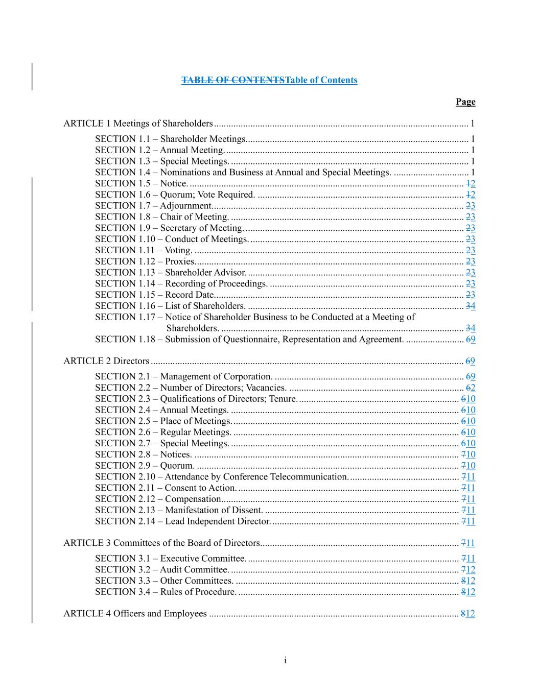 i TABLE OF CONTENTSTable of Contents Page ARTICLE 1 Meetings of Shareholders ......................................................................................................... 1 SECTION 1.1 – Shareholder Meetings. ........................................................................................... 1 SECTION 1.2 – Annual Meeting. .................................................................................................... 1 SECTION 1.3 – Special Meetings. .................................................................................................. 1 SECTION 1.4 – Nominations and Business at Annual and Special Meetings. ............................... 1 SECTION 1.5 – Notice. ................................................................................................................. 12 SECTION 1.6 – Quorum; Vote Required. ..................................................................................... 12 SECTION 1.7 – Adjournment. ....................................................................................................... 23 SECTION 1.8 – Chair of Meeting. ................................................................................................ 23 SECTION 1.9 – Secretary of Meeting. .......................................................................................... 23 SECTION 1.10 – Conduct of Meetings. ........................................................................................ 23 SECTION 1.11 – Voting. ............................................................................................................... 23 SECTION 1.12 – Proxies. .............................................................................................................. 23 SECTION 1.13 – Shareholder Advisor. ......................................................................................... 23 SECTION 1.14 – Recording of Proceedings. ................................................................................ 23 SECTION 1.15 – Record Date. ...................................................................................................... 23 SECTION 1.16 – List of Shareholders. ......................................................................................... 34 SECTION 1.17 – Notice of Shareholder Business to be Conducted at a Meeting of Shareholders. .................................................................................................... 34 SECTION 1.18 – Submission of Questionnaire, Representation and Agreement. ........................ 69 ARTICLE 2 Directors ................................................................................................................................. 69 SECTION 2.1 – Management of Corporation. .............................................................................. 69 SECTION 2.2 – Number of Directors; Vacancies. ........................................................................ 62 SECTION 2.3 – Qualifications of Directors; Tenure. .................................................................. 610 SECTION 2.4 – Annual Meetings. .............................................................................................. 610 SECTION 2.5 – Place of Meetings. ............................................................................................. 610 SECTION 2.6 – Regular Meetings. ............................................................................................. 610 SECTION 2.7 – Special Meetings. .............................................................................................. 610 SECTION 2.8 – Notices. ............................................................................................................. 710 SECTION 2.9 – Quorum. ............................................................................................................ 710 SECTION 2.10 – Attendance by Conference Telecommunication. ............................................. 711 SECTION 2.11 – Consent to Action. ........................................................................................... 711 SECTION 2.12 – Compensation. ................................................................................................. 711 SECTION 2.13 – Manifestation of Dissent. ................................................................................ 711 SECTION 2.14 – Lead Independent Director. ............................................................................. 711 ARTICLE 3 Committees of the Board of Directors .................................................................................. 711 SECTION 3.1 – Executive Committee. ....................................................................................... 711 SECTION 3.2 – Audit Committee. .............................................................................................. 712 SECTION 3.3 – Other Committees. ............................................................................................ 812 SECTION 3.4 – Rules of Procedure. ........................................................................................... 812 ARTICLE 4 Officers and Employees ....................................................................................................... 812