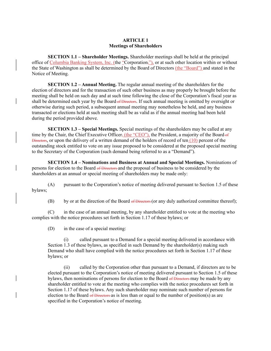 ARTICLE 1 Meetings of Shareholders SECTION 1.1 – Shareholder Meetings. Shareholder meetings shall be held at the principal office of Columbia Banking System, Inc. (the “Corporation,”), or at such other location within or without the State of Washington as shall be determined by the Board of Directors (the “Board”) and stated in the Notice of Meeting. SECTION 1.2 – Annual Meeting. The regular annual meeting of the shareholders for the election of directors and for the transaction of such other business as may properly be brought before the meeting shall be held on such day and at such time following the close of the Corporation’s fiscal year as shall be determined each year by the Board of Directors. If such annual meeting is omitted by oversight or otherwise during such period, a subsequent annual meeting may nonetheless be held, and any business transacted or elections held at such meeting shall be as valid as if the annual meeting had been held during the period provided above. SECTION 1.3 – Special Meetings. Special meetings of the shareholders may be called at any time by the Chair, the Chief Executive Officer, (the “CEO”), the President, a majority of the Board of Directors, or upon the delivery of a written demand of the holders of record of ten (10) percent of the outstanding stock entitled to vote on any issue proposed to be considered at the proposed special meeting to the Secretary of the Corporation (such demand being referred to as a “Demand”). SECTION 1.4 – Nominations and Business at Annual and Special Meetings. Nominations of persons for election to the Board of Directors and the proposal of business to be considered by the shareholders at an annual or special meeting of shareholders may be made only: (A) pursuant to the Corporation’s notice of meeting delivered pursuant to Section 1.5 of these bylaws; (B) by or at the direction of the Board of Directors (or any duly authorized committee thereof); (C) in the case of an annual meeting, by any shareholder entitled to vote at the meeting who complies with the notice procedures set forth in Section 1.17 of these bylaws; or (D) in the case of a special meeting: (i) called pursuant to a Demand for a special meeting delivered in accordance with Section 1.3 of these bylaws, as specified in such Demand by the shareholder(s) making such Demand who shall have complied with the notice procedures set forth in Section 1.17 of these bylaws; or (ii) called by the Corporation other than pursuant to a Demand, if directors are to be elected pursuant to the Corporation’s notice of meeting delivered pursuant to Section 1.5 of these bylaws, then nominations of persons for election to the Board of Directors may be made by any shareholder entitled to vote at the meeting who complies with the notice procedures set forth in Section 1.17 of these bylaws. Any such shareholder may nominate such number of persons for election to the Board of Directors as is less than or equal to the number of position(s) as are specified in the Corporation’s notice of meeting.