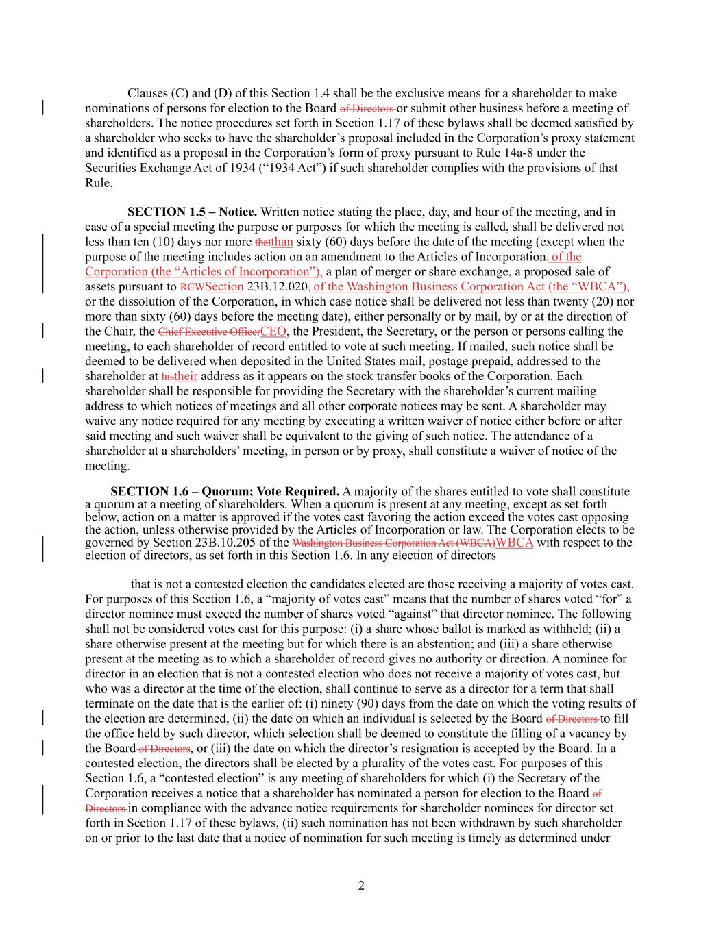 2 Clauses (C) and (D) of this Section 1.4 shall be the exclusive means for a shareholder to make nominations of persons for election to the Board of Directors or submit other business before a meeting of shareholders. The notice procedures set forth in Section 1.17 of these bylaws shall be deemed satisfied by a shareholder who seeks to have the shareholder’s proposal included in the Corporation’s proxy statement and identified as a proposal in the Corporation’s form of proxy pursuant to Rule 14a-8 under the Securities Exchange Act of 1934 (“1934 Act”) if such shareholder complies with the provisions of that Rule. SECTION 1.5 – Notice. Written notice stating the place, day, and hour of the meeting, and in case of a special meeting the purpose or purposes for which the meeting is called, shall be delivered not less than ten (10) days nor more thatthan sixty (60) days before the date of the meeting (except when the purpose of the meeting includes action on an amendment to the Articles of Incorporation, of the Corporation (the “Articles of Incorporation”), a plan of merger or share exchange, a proposed sale of assets pursuant to RCWSection 23B.12.020, of the Washington Business Corporation Act (the “WBCA”), or the dissolution of the Corporation, in which case notice shall be delivered not less than twenty (20) nor more than sixty (60) days before the meeting date), either personally or by mail, by or at the direction of the Chair, the Chief Executive OfficerCEO, the President, the Secretary, or the person or persons calling the meeting, to each shareholder of record entitled to vote at such meeting. If mailed, such notice shall be deemed to be delivered when deposited in the United States mail, postage prepaid, addressed to the shareholder at histheir address as it appears on the stock transfer books of the Corporation. Each shareholder shall be responsible for providing the Secretary with the shareholder’s current mailing address to which notices of meetings and all other corporate notices may be sent. A shareholder may waive any notice required for any meeting by executing a written waiver of notice either before or after said meeting and such waiver shall be equivalent to the giving of such notice. The attendance of a shareholder at a shareholders’ meeting, in person or by proxy, shall constitute a waiver of notice of the meeting. SECTION 1.6 – Quorum; Vote Required. A majority of the shares entitled to vote shall constitute a quorum at a meeting of shareholders. When a quorum is present at any meeting, except as set forth below, action on a matter is approved if the votes cast favoring the action exceed the votes cast opposing the action, unless otherwise provided by the Articles of Incorporation or law. The Corporation elects to be governed by Section 23B.10.205 of the Washington Business Corporation Act (WBCA)WBCA with respect to the election of directors, as set forth in this Section 1.6. In any election of directors that is not a contested election the candidates elected are those receiving a majority of votes cast. For purposes of this Section 1.6, a “majority of votes cast” means that the number of shares voted “for” a director nominee must exceed the number of shares voted “against” that director nominee. The following shall not be considered votes cast for this purpose: (i) a share whose ballot is marked as withheld; (ii) a share otherwise present at the meeting but for which there is an abstention; and (iii) a share otherwise present at the meeting as to which a shareholder of record gives no authority or direction. A nominee for director in an election that is not a contested election who does not receive a majority of votes cast, but who was a director at the time of the election, shall continue to serve as a director for a term that shall terminate on the date that is the earlier of: (i) ninety (90) days from the date on which the voting results of the election are determined, (ii) the date on which an individual is selected by the Board of Directors to fill the office held by such director, which selection shall be deemed to constitute the filling of a vacancy by the Board of Directors, or (iii) the date on which the director’s resignation is accepted by the Board. In a contested election, the directors shall be elected by a plurality of the votes cast. For purposes of this Section 1.6, a “contested election” is any meeting of shareholders for which (i) the Secretary of the Corporation receives a notice that a shareholder has nominated a person for election to the Board of Directors in compliance with the advance notice requirements for shareholder nominees for director set forth in Section 1.17 of these bylaws, (ii) such nomination has not been withdrawn by such shareholder on or prior to the last date that a notice of nomination for such meeting is timely as determined under