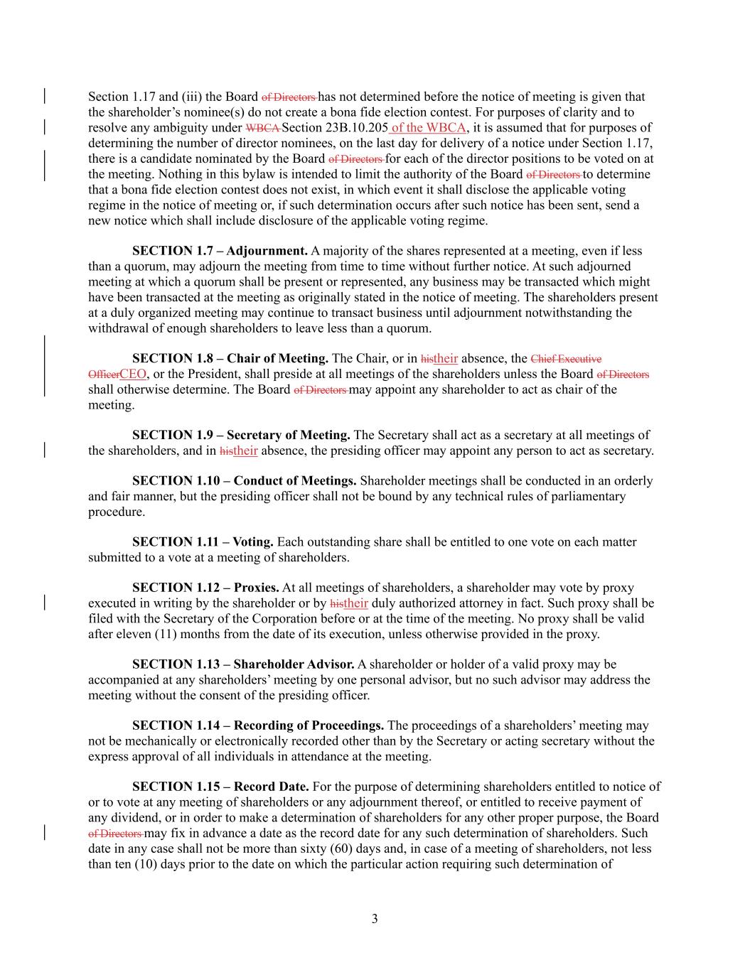 3 Section 1.17 and (iii) the Board of Directors has not determined before the notice of meeting is given that the shareholder’s nominee(s) do not create a bona fide election contest. For purposes of clarity and to resolve any ambiguity under WBCA Section 23B.10.205 of the WBCA, it is assumed that for purposes of determining the number of director nominees, on the last day for delivery of a notice under Section 1.17, there is a candidate nominated by the Board of Directors for each of the director positions to be voted on at the meeting. Nothing in this bylaw is intended to limit the authority of the Board of Directors to determine that a bona fide election contest does not exist, in which event it shall disclose the applicable voting regime in the notice of meeting or, if such determination occurs after such notice has been sent, send a new notice which shall include disclosure of the applicable voting regime. SECTION 1.7 – Adjournment. A majority of the shares represented at a meeting, even if less than a quorum, may adjourn the meeting from time to time without further notice. At such adjourned meeting at which a quorum shall be present or represented, any business may be transacted which might have been transacted at the meeting as originally stated in the notice of meeting. The shareholders present at a duly organized meeting may continue to transact business until adjournment notwithstanding the withdrawal of enough shareholders to leave less than a quorum. SECTION 1.8 – Chair of Meeting. The Chair, or in histheir absence, the Chief Executive OfficerCEO, or the President, shall preside at all meetings of the shareholders unless the Board of Directors shall otherwise determine. The Board of Directors may appoint any shareholder to act as chair of the meeting. SECTION 1.9 – Secretary of Meeting. The Secretary shall act as a secretary at all meetings of the shareholders, and in histheir absence, the presiding officer may appoint any person to act as secretary. SECTION 1.10 – Conduct of Meetings. Shareholder meetings shall be conducted in an orderly and fair manner, but the presiding officer shall not be bound by any technical rules of parliamentary procedure. SECTION 1.11 – Voting. Each outstanding share shall be entitled to one vote on each matter submitted to a vote at a meeting of shareholders. SECTION 1.12 – Proxies. At all meetings of shareholders, a shareholder may vote by proxy executed in writing by the shareholder or by histheir duly authorized attorney in fact. Such proxy shall be filed with the Secretary of the Corporation before or at the time of the meeting. No proxy shall be valid after eleven (11) months from the date of its execution, unless otherwise provided in the proxy. SECTION 1.13 – Shareholder Advisor. A shareholder or holder of a valid proxy may be accompanied at any shareholders’ meeting by one personal advisor, but no such advisor may address the meeting without the consent of the presiding officer. SECTION 1.14 – Recording of Proceedings. The proceedings of a shareholders’ meeting may not be mechanically or electronically recorded other than by the Secretary or acting secretary without the express approval of all individuals in attendance at the meeting. SECTION 1.15 – Record Date. For the purpose of determining shareholders entitled to notice of or to vote at any meeting of shareholders or any adjournment thereof, or entitled to receive payment of any dividend, or in order to make a determination of shareholders for any other proper purpose, the Board of Directors may fix in advance a date as the record date for any such determination of shareholders. Such date in any case shall not be more than sixty (60) days and, in case of a meeting of shareholders, not less than ten (10) days prior to the date on which the particular action requiring such determination of