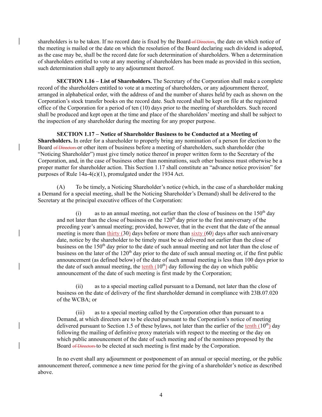 4 shareholders is to be taken. If no record date is fixed by the Board of Directors, the date on which notice of the meeting is mailed or the date on which the resolution of the Board declaring such dividend is adopted, as the case may be, shall be the record date for such determination of shareholders. When a determination of shareholders entitled to vote at any meeting of shareholders has been made as provided in this section, such determination shall apply to any adjournment thereof. SECTION 1.16 – List of Shareholders. The Secretary of the Corporation shall make a complete record of the shareholders entitled to vote at a meeting of shareholders, or any adjournment thereof, arranged in alphabetical order, with the address of and the number of shares held by each as shown on the Corporation’s stock transfer books on the record date. Such record shall be kept on file at the registered office of the Corporation for a period of ten (10) days prior to the meeting of shareholders. Such record shall be produced and kept open at the time and place of the shareholders’ meeting and shall be subject to the inspection of any shareholder during the meeting for any proper purpose. SECTION 1.17 – Notice of Shareholder Business to be Conducted at a Meeting of Shareholders. In order for a shareholder to properly bring any nomination of a person for election to the Board of Directors or other item of business before a meeting of shareholders, such shareholder (the “Noticing Shareholder”) must give timely notice thereof in proper written form to the Secretary of the Corporation, and, in the case of business other than nominations, such other business must otherwise be a proper matter for shareholder action. This Section 1.17 shall constitute an “advance notice provision” for purposes of Rule 14a-4(c)(1), promulgated under the 1934 Act. (A) To be timely, a Noticing Shareholder’s notice (which, in the case of a shareholder making a Demand for a special meeting, shall be the Noticing Shareholder’s Demand) shall be delivered to the Secretary at the principal executive offices of the Corporation: (i) as to an annual meeting, not earlier than the close of business on the 150th day and not later than the close of business on the 120th day prior to the first anniversary of the preceding year’s annual meeting; provided, however, that in the event that the date of the annual meeting is more than thirty (30) days before or more than sixty (60) days after such anniversary date, notice by the shareholder to be timely must be so delivered not earlier than the close of business on the 150th day prior to the date of such annual meeting and not later than the close of business on the later of the 120th day prior to the date of such annual meeting or, if the first public announcement (as defined below) of the date of such annual meeting is less than 100 days prior to the date of such annual meeting, the tenth (10th) day following the day on which public announcement of the date of such meeting is first made by the Corporation; (ii) as to a special meeting called pursuant to a Demand, not later than the close of business on the date of delivery of the first shareholder demand in compliance with 23B.07.020 of the WCBA; or (iii) as to a special meeting called by the Corporation other than pursuant to a Demand, at which directors are to be elected pursuant to the Corporation’s notice of meeting delivered pursuant to Section 1.5 of these bylaws, not later than the earlier of the tenth (10th) day following the mailing of definitive proxy materials with respect to the meeting or the day on which public announcement of the date of such meeting and of the nominees proposed by the Board of Directors to be elected at such meeting is first made by the Corporation. In no event shall any adjournment or postponement of an annual or special meeting, or the public announcement thereof, commence a new time period for the giving of a shareholder’s notice as described above.