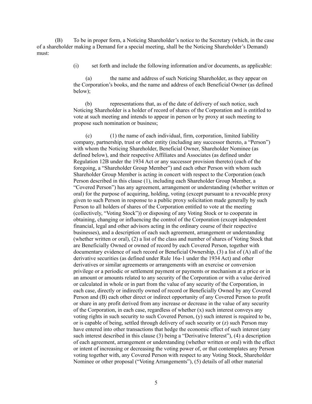 5 (B) To be in proper form, a Noticing Shareholder’s notice to the Secretary (which, in the case of a shareholder making a Demand for a special meeting, shall be the Noticing Shareholder’s Demand) must: (i) set forth and include the following information and/or documents, as applicable: (a) the name and address of such Noticing Shareholder, as they appear on the Corporation’s books, and the name and address of each Beneficial Owner (as defined below); (b) representations that, as of the date of delivery of such notice, such Noticing Shareholder is a holder of record of shares of the Corporation and is entitled to vote at such meeting and intends to appear in person or by proxy at such meeting to propose such nomination or business; (c) (1) the name of each individual, firm, corporation, limited liability company, partnership, trust or other entity (including any successor thereto, a “Person”) with whom the Noticing Shareholder, Beneficial Owner, Shareholder Nominee (as defined below), and their respective Affiliates and Associates (as defined under Regulation 12B under the 1934 Act or any successor provision thereto) (each of the foregoing, a “Shareholder Group Member”) and each other Person with whom such Shareholder Group Member is acting in concert with respect to the Corporation (each Person described in this clause (1), including each Shareholder Group Member, a “Covered Person”) has any agreement, arrangement or understanding (whether written or oral) for the purpose of acquiring, holding, voting (except pursuant to a revocable proxy given to such Person in response to a public proxy solicitation made generally by such Person to all holders of shares of the Corporation entitled to vote at the meeting (collectively, “Voting Stock”)) or disposing of any Voting Stock or to cooperate in obtaining, changing or influencing the control of the Corporation (except independent financial, legal and other advisors acting in the ordinary course of their respective businesses), and a description of each such agreement, arrangement or understanding (whether written or oral), (2) a list of the class and number of shares of Voting Stock that are Beneficially Owned or owned of record by each Covered Person, together with documentary evidence of such record or Beneficial Ownership, (3) a list of (A) all of the derivative securities (as defined under Rule 16a-1 under the 1934 Act) and other derivatives or similar agreements or arrangements with an exercise or conversion privilege or a periodic or settlement payment or payments or mechanism at a price or in an amount or amounts related to any security of the Corporation or with a value derived or calculated in whole or in part from the value of any security of the Corporation, in each case, directly or indirectly owned of record or Beneficially Owned by any Covered Person and (B) each other direct or indirect opportunity of any Covered Person to profit or share in any profit derived from any increase or decrease in the value of any security of the Corporation, in each case, regardless of whether (x) such interest conveys any voting rights in such security to such Covered Person, (y) such interest is required to be, or is capable of being, settled through delivery of such security or (z) such Person may have entered into other transactions that hedge the economic effect of such interest (any such interest described in this clause (3) being a “Derivative Interest”), (4) a description of each agreement, arrangement or understanding (whether written or oral) with the effect or intent of increasing or decreasing the voting power of, or that contemplates any Person voting together with, any Covered Person with respect to any Voting Stock, Shareholder Nominee or other proposal (“Voting Arrangements”), (5) details of all other material