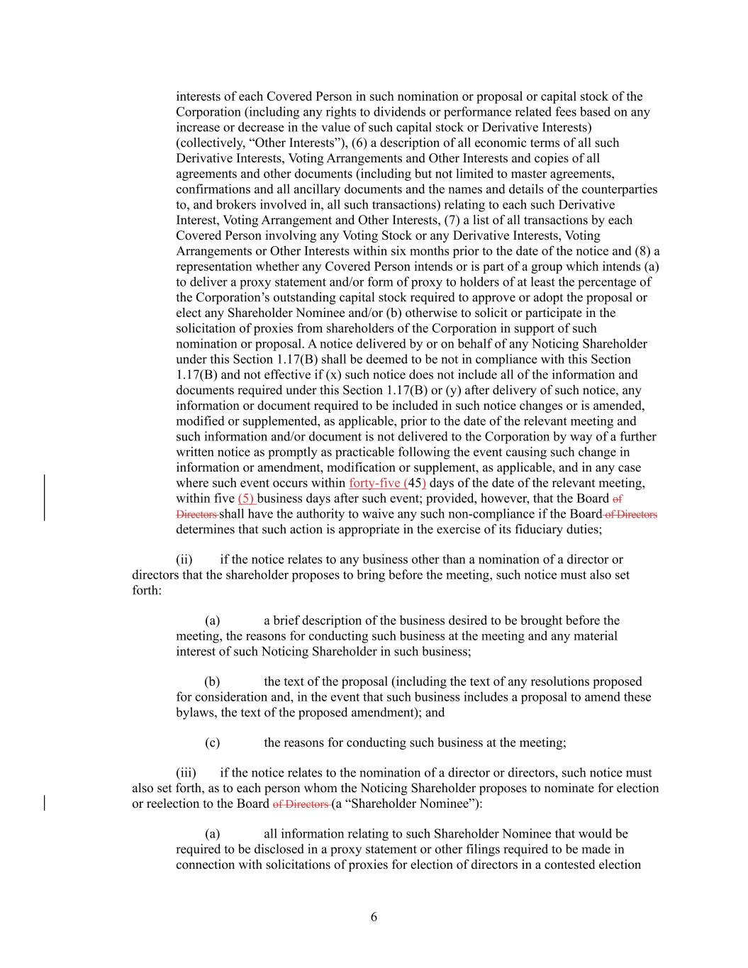 6 interests of each Covered Person in such nomination or proposal or capital stock of the Corporation (including any rights to dividends or performance related fees based on any increase or decrease in the value of such capital stock or Derivative Interests) (collectively, “Other Interests”), (6) a description of all economic terms of all such Derivative Interests, Voting Arrangements and Other Interests and copies of all agreements and other documents (including but not limited to master agreements, confirmations and all ancillary documents and the names and details of the counterparties to, and brokers involved in, all such transactions) relating to each such Derivative Interest, Voting Arrangement and Other Interests, (7) a list of all transactions by each Covered Person involving any Voting Stock or any Derivative Interests, Voting Arrangements or Other Interests within six months prior to the date of the notice and (8) a representation whether any Covered Person intends or is part of a group which intends (a) to deliver a proxy statement and/or form of proxy to holders of at least the percentage of the Corporation’s outstanding capital stock required to approve or adopt the proposal or elect any Shareholder Nominee and/or (b) otherwise to solicit or participate in the solicitation of proxies from shareholders of the Corporation in support of such nomination or proposal. A notice delivered by or on behalf of any Noticing Shareholder under this Section 1.17(B) shall be deemed to be not in compliance with this Section 1.17(B) and not effective if (x) such notice does not include all of the information and documents required under this Section 1.17(B) or (y) after delivery of such notice, any information or document required to be included in such notice changes or is amended, modified or supplemented, as applicable, prior to the date of the relevant meeting and such information and/or document is not delivered to the Corporation by way of a further written notice as promptly as practicable following the event causing such change in information or amendment, modification or supplement, as applicable, and in any case where such event occurs within forty-five (45) days of the date of the relevant meeting, within five (5) business days after such event; provided, however, that the Board of Directors shall have the authority to waive any such non-compliance if the Board of Directors determines that such action is appropriate in the exercise of its fiduciary duties; (ii) if the notice relates to any business other than a nomination of a director or directors that the shareholder proposes to bring before the meeting, such notice must also set forth: (a) a brief description of the business desired to be brought before the meeting, the reasons for conducting such business at the meeting and any material interest of such Noticing Shareholder in such business; (b) the text of the proposal (including the text of any resolutions proposed for consideration and, in the event that such business includes a proposal to amend these bylaws, the text of the proposed amendment); and (c) the reasons for conducting such business at the meeting; (iii) if the notice relates to the nomination of a director or directors, such notice must also set forth, as to each person whom the Noticing Shareholder proposes to nominate for election or reelection to the Board of Directors (a “Shareholder Nominee”): (a) all information relating to such Shareholder Nominee that would be required to be disclosed in a proxy statement or other filings required to be made in connection with solicitations of proxies for election of directors in a contested election
