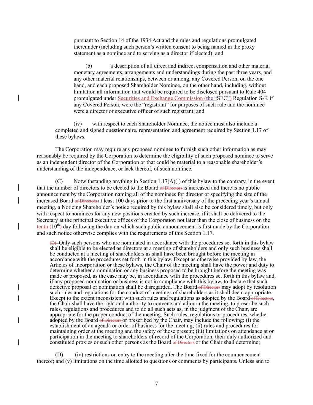 7 pursuant to Section 14 of the 1934 Act and the rules and regulations promulgated thereunder (including such person’s written consent to being named in the proxy statement as a nominee and to serving as a director if elected); and (b) a description of all direct and indirect compensation and other material monetary agreements, arrangements and understandings during the past three years, and any other material relationships, between or among, any Covered Person, on the one hand, and each proposed Shareholder Nominee, on the other hand, including, without limitation all information that would be required to be disclosed pursuant to Rule 404 promulgated under Securities and Exchange Commission (the “SEC”) Regulation S-K if any Covered Person, were the “registrant” for purposes of such rule and the nominee were a director or executive officer of such registrant; and (iv) with respect to each Shareholder Nominee, the notice must also include a completed and signed questionnaire, representation and agreement required by Section 1.17 of these bylaws. The Corporation may require any proposed nominee to furnish such other information as may reasonably be required by the Corporation to determine the eligibility of such proposed nominee to serve as an independent director of the Corporation or that could be material to a reasonable shareholder’s understanding of the independence, or lack thereof, of such nominee. (C) Notwithstanding anything in Section 1.17(A)(i) of this bylaw to the contrary, in the event that the number of directors to be elected to the Board of Directors is increased and there is no public announcement by the Corporation naming all of the nominees for director or specifying the size of the increased Board of Directors at least 100 days prior to the first anniversary of the preceding year’s annual meeting, a Noticing Shareholder’s notice required by this bylaw shall also be considered timely, but only with respect to nominees for any new positions created by such increase, if it shall be delivered to the Secretary at the principal executive offices of the Corporation not later than the close of business on the tenth (10th) day following the day on which such public announcement is first made by the Corporation and such notice otherwise complies with the requirements of this Section 1.17. (D) Only such persons who are nominated in accordance with the procedures set forth in this bylaw shall be eligible to be elected as directors at a meeting of shareholders and only such business shall be conducted at a meeting of shareholders as shall have been brought before the meeting in accordance with the procedures set forth in this bylaw. Except as otherwise provided by law, the Articles of Incorporation or these bylaws, the Chair of the meeting shall have the power and duty to determine whether a nomination or any business proposed to be brought before the meeting was made or proposed, as the case may be, in accordance with the procedures set forth in this bylaw and, if any proposed nomination or business is not in compliance with this bylaw, to declare that such defective proposal or nomination shall be disregarded. The Board of Directors may adopt by resolution such rules and regulations for the conduct of meetings of shareholders as it shall deem appropriate. Except to the extent inconsistent with such rules and regulations as adopted by the Board of Directors, the Chair shall have the right and authority to convene and adjourn the meeting, to prescribe such rules, regulations and procedures and to do all such acts as, in the judgment of the Chair, are appropriate for the proper conduct of the meeting. Such rules, regulations or procedures, whether adopted by the Board of Directors or prescribed by the Chair, may include the following: (i) the establishment of an agenda or order of business for the meeting; (ii) rules and procedures for maintaining order at the meeting and the safety of those present; (iii) limitations on attendance at or participation in the meeting to shareholders of record of the Corporation, their duly authorized and constituted proxies or such other persons as the Board of Directors or the Chair shall determine; (D) (iv) restrictions on entry to the meeting after the time fixed for the commencement thereof; and (v) limitations on the time allotted to questions or comments by participants. Unless and to