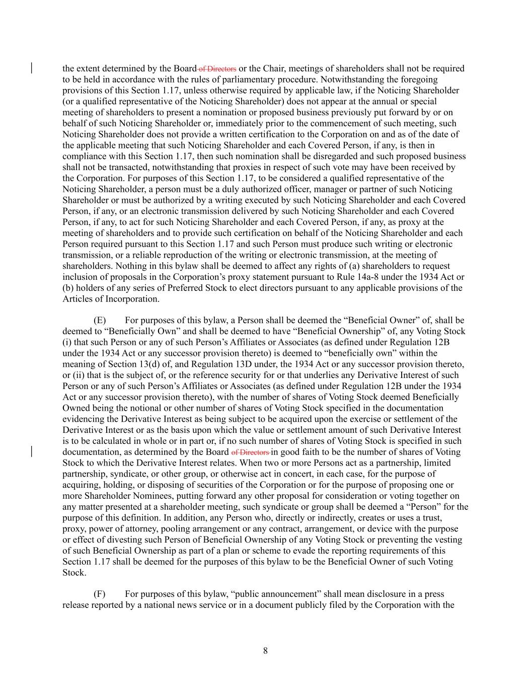 8 the extent determined by the Board of Directors or the Chair, meetings of shareholders shall not be required to be held in accordance with the rules of parliamentary procedure. Notwithstanding the foregoing provisions of this Section 1.17, unless otherwise required by applicable law, if the Noticing Shareholder (or a qualified representative of the Noticing Shareholder) does not appear at the annual or special meeting of shareholders to present a nomination or proposed business previously put forward by or on behalf of such Noticing Shareholder or, immediately prior to the commencement of such meeting, such Noticing Shareholder does not provide a written certification to the Corporation on and as of the date of the applicable meeting that such Noticing Shareholder and each Covered Person, if any, is then in compliance with this Section 1.17, then such nomination shall be disregarded and such proposed business shall not be transacted, notwithstanding that proxies in respect of such vote may have been received by the Corporation. For purposes of this Section 1.17, to be considered a qualified representative of the Noticing Shareholder, a person must be a duly authorized officer, manager or partner of such Noticing Shareholder or must be authorized by a writing executed by such Noticing Shareholder and each Covered Person, if any, or an electronic transmission delivered by such Noticing Shareholder and each Covered Person, if any, to act for such Noticing Shareholder and each Covered Person, if any, as proxy at the meeting of shareholders and to provide such certification on behalf of the Noticing Shareholder and each Person required pursuant to this Section 1.17 and such Person must produce such writing or electronic transmission, or a reliable reproduction of the writing or electronic transmission, at the meeting of shareholders. Nothing in this bylaw shall be deemed to affect any rights of (a) shareholders to request inclusion of proposals in the Corporation’s proxy statement pursuant to Rule 14a-8 under the 1934 Act or (b) holders of any series of Preferred Stock to elect directors pursuant to any applicable provisions of the Articles of Incorporation. (E) For purposes of this bylaw, a Person shall be deemed the “Beneficial Owner” of, shall be deemed to “Beneficially Own” and shall be deemed to have “Beneficial Ownership” of, any Voting Stock (i) that such Person or any of such Person’s Affiliates or Associates (as defined under Regulation 12B under the 1934 Act or any successor provision thereto) is deemed to “beneficially own” within the meaning of Section 13(d) of, and Regulation 13D under, the 1934 Act or any successor provision thereto, or (ii) that is the subject of, or the reference security for or that underlies any Derivative Interest of such Person or any of such Person’s Affiliates or Associates (as defined under Regulation 12B under the 1934 Act or any successor provision thereto), with the number of shares of Voting Stock deemed Beneficially Owned being the notional or other number of shares of Voting Stock specified in the documentation evidencing the Derivative Interest as being subject to be acquired upon the exercise or settlement of the Derivative Interest or as the basis upon which the value or settlement amount of such Derivative Interest is to be calculated in whole or in part or, if no such number of shares of Voting Stock is specified in such documentation, as determined by the Board of Directors in good faith to be the number of shares of Voting Stock to which the Derivative Interest relates. When two or more Persons act as a partnership, limited partnership, syndicate, or other group, or otherwise act in concert, in each case, for the purpose of acquiring, holding, or disposing of securities of the Corporation or for the purpose of proposing one or more Shareholder Nominees, putting forward any other proposal for consideration or voting together on any matter presented at a shareholder meeting, such syndicate or group shall be deemed a “Person” for the purpose of this definition. In addition, any Person who, directly or indirectly, creates or uses a trust, proxy, power of attorney, pooling arrangement or any contract, arrangement, or device with the purpose or effect of divesting such Person of Beneficial Ownership of any Voting Stock or preventing the vesting of such Beneficial Ownership as part of a plan or scheme to evade the reporting requirements of this Section 1.17 shall be deemed for the purposes of this bylaw to be the Beneficial Owner of such Voting Stock. (F) For purposes of this bylaw, “public announcement” shall mean disclosure in a press release reported by a national news service or in a document publicly filed by the Corporation with the