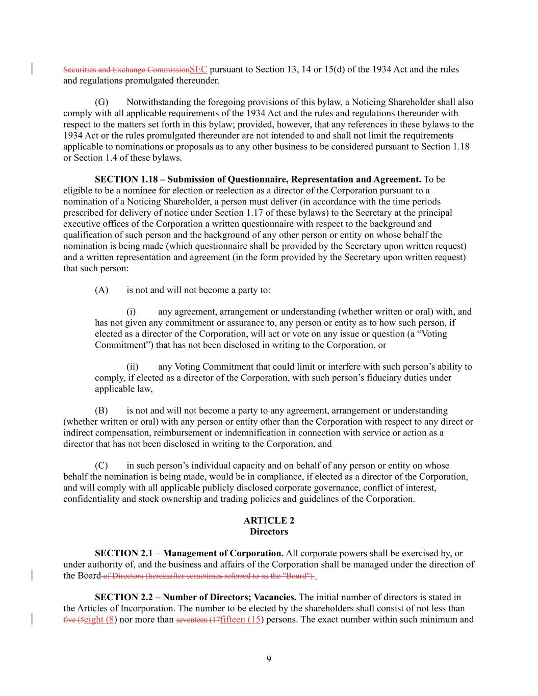 9 Securities and Exchange CommissionSEC pursuant to Section 13, 14 or 15(d) of the 1934 Act and the rules and regulations promulgated thereunder. (G) Notwithstanding the foregoing provisions of this bylaw, a Noticing Shareholder shall also comply with all applicable requirements of the 1934 Act and the rules and regulations thereunder with respect to the matters set forth in this bylaw; provided, however, that any references in these bylaws to the 1934 Act or the rules promulgated thereunder are not intended to and shall not limit the requirements applicable to nominations or proposals as to any other business to be considered pursuant to Section 1.18 or Section 1.4 of these bylaws. SECTION 1.18 – Submission of Questionnaire, Representation and Agreement. To be eligible to be a nominee for election or reelection as a director of the Corporation pursuant to a nomination of a Noticing Shareholder, a person must deliver (in accordance with the time periods prescribed for delivery of notice under Section 1.17 of these bylaws) to the Secretary at the principal executive offices of the Corporation a written questionnaire with respect to the background and qualification of such person and the background of any other person or entity on whose behalf the nomination is being made (which questionnaire shall be provided by the Secretary upon written request) and a written representation and agreement (in the form provided by the Secretary upon written request) that such person: (A) is not and will not become a party to: (i) any agreement, arrangement or understanding (whether written or oral) with, and has not given any commitment or assurance to, any person or entity as to how such person, if elected as a director of the Corporation, will act or vote on any issue or question (a “Voting Commitment”) that has not been disclosed in writing to the Corporation, or (ii) any Voting Commitment that could limit or interfere with such person’s ability to comply, if elected as a director of the Corporation, with such person’s fiduciary duties under applicable law, (B) is not and will not become a party to any agreement, arrangement or understanding (whether written or oral) with any person or entity other than the Corporation with respect to any direct or indirect compensation, reimbursement or indemnification in connection with service or action as a director that has not been disclosed in writing to the Corporation, and (C) in such person’s individual capacity and on behalf of any person or entity on whose behalf the nomination is being made, would be in compliance, if elected as a director of the Corporation, and will comply with all applicable publicly disclosed corporate governance, conflict of interest, confidentiality and stock ownership and trading policies and guidelines of the Corporation. ARTICLE 2 Directors SECTION 2.1 – Management of Corporation. All corporate powers shall be exercised by, or under authority of, and the business and affairs of the Corporation shall be managed under the direction of the Board of Directors (hereinafter sometimes referred to as the "Board").. SECTION 2.2 – Number of Directors; Vacancies. The initial number of directors is stated in the Articles of Incorporation. The number to be elected by the shareholders shall consist of not less than five (5eight (8) nor more than seventeen (17fifteen (15) persons. The exact number within such minimum and