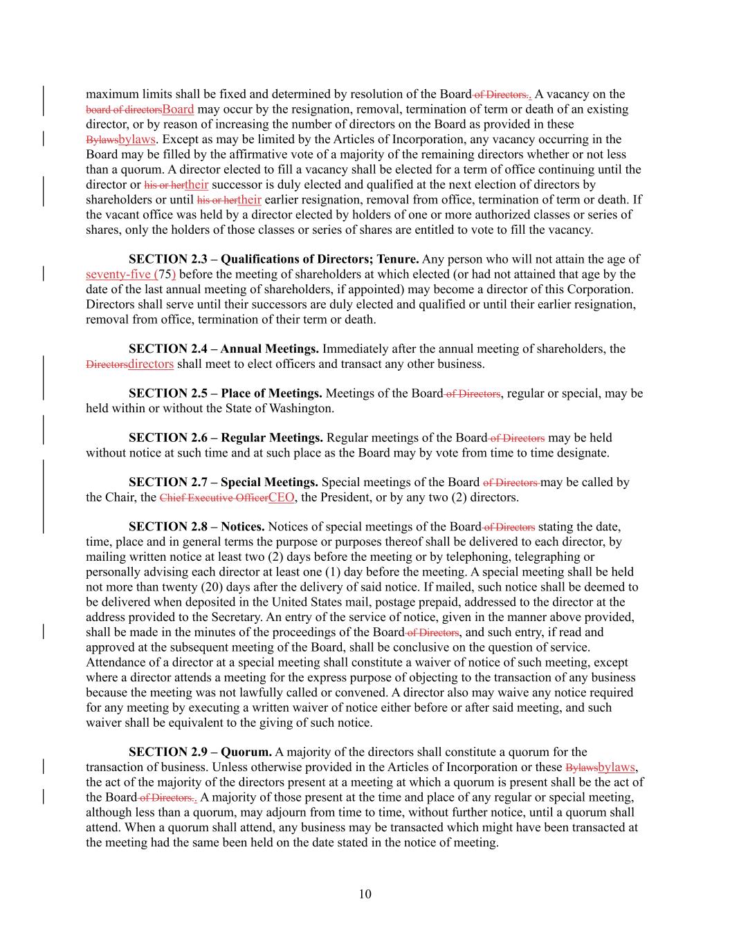 10 maximum limits shall be fixed and determined by resolution of the Board of Directors.. A vacancy on the board of directorsBoard may occur by the resignation, removal, termination of term or death of an existing director, or by reason of increasing the number of directors on the Board as provided in these Bylawsbylaws. Except as may be limited by the Articles of Incorporation, any vacancy occurring in the Board may be filled by the affirmative vote of a majority of the remaining directors whether or not less than a quorum. A director elected to fill a vacancy shall be elected for a term of office continuing until the director or his or hertheir successor is duly elected and qualified at the next election of directors by shareholders or until his or hertheir earlier resignation, removal from office, termination of term or death. If the vacant office was held by a director elected by holders of one or more authorized classes or series of shares, only the holders of those classes or series of shares are entitled to vote to fill the vacancy. SECTION 2.3 – Qualifications of Directors; Tenure. Any person who will not attain the age of seventy-five (75) before the meeting of shareholders at which elected (or had not attained that age by the date of the last annual meeting of shareholders, if appointed) may become a director of this Corporation. Directors shall serve until their successors are duly elected and qualified or until their earlier resignation, removal from office, termination of their term or death. SECTION 2.4 – Annual Meetings. Immediately after the annual meeting of shareholders, the Directorsdirectors shall meet to elect officers and transact any other business. SECTION 2.5 – Place of Meetings. Meetings of the Board of Directors, regular or special, may be held within or without the State of Washington. SECTION 2.6 – Regular Meetings. Regular meetings of the Board of Directors may be held without notice at such time and at such place as the Board may by vote from time to time designate. SECTION 2.7 – Special Meetings. Special meetings of the Board of Directors may be called by the Chair, the Chief Executive OfficerCEO, the President, or by any two (2) directors. SECTION 2.8 – Notices. Notices of special meetings of the Board of Directors stating the date, time, place and in general terms the purpose or purposes thereof shall be delivered to each director, by mailing written notice at least two (2) days before the meeting or by telephoning, telegraphing or personally advising each director at least one (1) day before the meeting. A special meeting shall be held not more than twenty (20) days after the delivery of said notice. If mailed, such notice shall be deemed to be delivered when deposited in the United States mail, postage prepaid, addressed to the director at the address provided to the Secretary. An entry of the service of notice, given in the manner above provided, shall be made in the minutes of the proceedings of the Board of Directors, and such entry, if read and approved at the subsequent meeting of the Board, shall be conclusive on the question of service. Attendance of a director at a special meeting shall constitute a waiver of notice of such meeting, except where a director attends a meeting for the express purpose of objecting to the transaction of any business because the meeting was not lawfully called or convened. A director also may waive any notice required for any meeting by executing a written waiver of notice either before or after said meeting, and such waiver shall be equivalent to the giving of such notice. SECTION 2.9 – Quorum. A majority of the directors shall constitute a quorum for the transaction of business. Unless otherwise provided in the Articles of Incorporation or these Bylawsbylaws, the act of the majority of the directors present at a meeting at which a quorum is present shall be the act of the Board of Directors.. A majority of those present at the time and place of any regular or special meeting, although less than a quorum, may adjourn from time to time, without further notice, until a quorum shall attend. When a quorum shall attend, any business may be transacted which might have been transacted at the meeting had the same been held on the date stated in the notice of meeting.