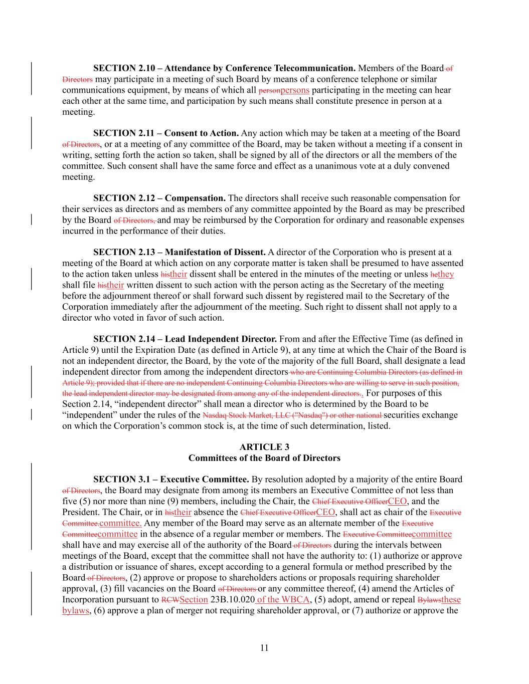 11 SECTION 2.10 – Attendance by Conference Telecommunication. Members of the Board of Directors may participate in a meeting of such Board by means of a conference telephone or similar communications equipment, by means of which all personpersons participating in the meeting can hear each other at the same time, and participation by such means shall constitute presence in person at a meeting. SECTION 2.11 – Consent to Action. Any action which may be taken at a meeting of the Board of Directors, or at a meeting of any committee of the Board, may be taken without a meeting if a consent in writing, setting forth the action so taken, shall be signed by all of the directors or all the members of the committee. Such consent shall have the same force and effect as a unanimous vote at a duly convened meeting. SECTION 2.12 – Compensation. The directors shall receive such reasonable compensation for their services as directors and as members of any committee appointed by the Board as may be prescribed by the Board of Directors, and may be reimbursed by the Corporation for ordinary and reasonable expenses incurred in the performance of their duties. SECTION 2.13 – Manifestation of Dissent. A director of the Corporation who is present at a meeting of the Board at which action on any corporate matter is taken shall be presumed to have assented to the action taken unless histheir dissent shall be entered in the minutes of the meeting or unless hethey shall file histheir written dissent to such action with the person acting as the Secretary of the meeting before the adjournment thereof or shall forward such dissent by registered mail to the Secretary of the Corporation immediately after the adjournment of the meeting. Such right to dissent shall not apply to a director who voted in favor of such action. SECTION 2.14 – Lead Independent Director. From and after the Effective Time (as defined in Article 9) until the Expiration Date (as defined in Article 9), at any time at which the Chair of the Board is not an independent director, the Board, by the vote of the majority of the full Board, shall designate a lead independent director from among the independent directors who are Continuing Columbia Directors (as defined in Article 9); provided that if there are no independent Continuing Columbia Directors who are willing to serve in such position, the lead independent director may be designated from among any of the independent directors.. For purposes of this Section 2.14, “independent director” shall mean a director who is determined by the Board to be “independent” under the rules of the Nasdaq Stock Market, LLC ("Nasdaq") or other national securities exchange on which the Corporation’s common stock is, at the time of such determination, listed. ARTICLE 3 Committees of the Board of Directors SECTION 3.1 – Executive Committee. By resolution adopted by a majority of the entire Board of Directors, the Board may designate from among its members an Executive Committee of not less than five (5) nor more than nine (9) members, including the Chair, the Chief Executive OfficerCEO, and the President. The Chair, or in histheir absence the Chief Executive OfficerCEO, shall act as chair of the Executive Committee.committee. Any member of the Board may serve as an alternate member of the Executive Committeecommittee in the absence of a regular member or members. The Executive Committeecommittee shall have and may exercise all of the authority of the Board of Directors during the intervals between meetings of the Board, except that the committee shall not have the authority to: (1) authorize or approve a distribution or issuance of shares, except according to a general formula or method prescribed by the Board of Directors, (2) approve or propose to shareholders actions or proposals requiring shareholder approval, (3) fill vacancies on the Board of Directors or any committee thereof, (4) amend the Articles of Incorporation pursuant to RCWSection 23B.10.020 of the WBCA, (5) adopt, amend or repeal Bylawsthese bylaws, (6) approve a plan of merger not requiring shareholder approval, or (7) authorize or approve the