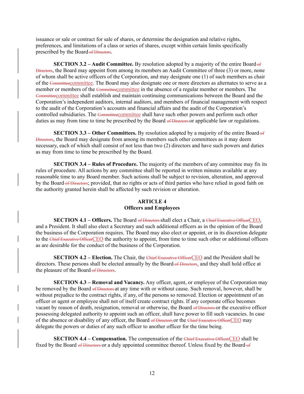 12 issuance or sale or contract for sale of shares, or determine the designation and relative rights, preferences, and limitations of a class or series of shares, except within certain limits specifically prescribed by the Board of Directors. SECTION 3.2 – Audit Committee. By resolution adopted by a majority of the entire Board of Directors, the Board may appoint from among its members an Audit Committee of three (3) or more, none of whom shall be active officers of the Corporation, and may designate one (1) of such members as chair of the Committeecommittee. The Board may also designate one or more directors as alternates to serve as a member or members of the Committeecommittee in the absence of a regular member or members. The Committeecommittee shall establish and maintain continuing communications between the Board and the Corporation’s independent auditors, internal auditors, and members of financial management with respect to the audit of the Corporation’s accounts and financial affairs and the audit of the Corporation’s controlled subsidiaries. The Committeecommittee shall have such other powers and perform such other duties as may from time to time be prescribed by the Board of Directors or applicable law or regulations. SECTION 3.3 – Other Committees. By resolution adopted by a majority of the entire Board of Directors, the Board may designate from among its members such other committees as it may deem necessary, each of which shall consist of not less than two (2) directors and have such powers and duties as may from time to time be prescribed by the Board. SECTION 3.4 – Rules of Procedure. The majority of the members of any committee may fix its rules of procedure. All actions by any committee shall be reported in written minutes available at any reasonable time to any Board member. Such actions shall be subject to revision, alteration, and approval by the Board of Directors; provided, that no rights or acts of third parties who have relied in good faith on the authority granted herein shall be affected by such revision or alteration. ARTICLE 4 Officers and Employees SECTION 4.1 – Officers. The Board of Directors shall elect a Chair, a Chief Executive OfficerCEO, and a President. It shall also elect a Secretary and such additional officers as in the opinion of the Board the business of the Corporation requires. The Board may also elect or appoint, or in its discretion delegate to the Chief Executive OfficerCEO the authority to appoint, from time to time such other or additional officers as are desirable for the conduct of the business of the Corporation. SECTION 4.2 – Election. The Chair, the Chief Executive OfficerCEO and the President shall be directors. These persons shall be elected annually by the Board of Directors, and they shall hold office at the pleasure of the Board of Directors. SECTION 4.3 – Removal and Vacancy. Any officer, agent, or employee of the Corporation may be removed by the Board of Directors at any time with or without cause. Such removal, however, shall be without prejudice to the contract rights, if any, of the persons so removed. Election or appointment of an officer or agent or employee shall not of itself create contract rights. If any corporate office becomes vacant by reason of death, resignation, removal or otherwise, the Board of Directors or the executive officer possessing delegated authority to appoint such an officer, shall have power to fill such vacancies. In case of the absence or disability of any officer, the Board of Directors or the Chief Executive OfficerCEO may delegate the powers or duties of any such officer to another officer for the time being. SECTION 4.4 – Compensation. The compensation of the Chief Executive OfficerCEO shall be fixed by the Board of Directors or a duly appointed committee thereof. Unless fixed by the Board of
