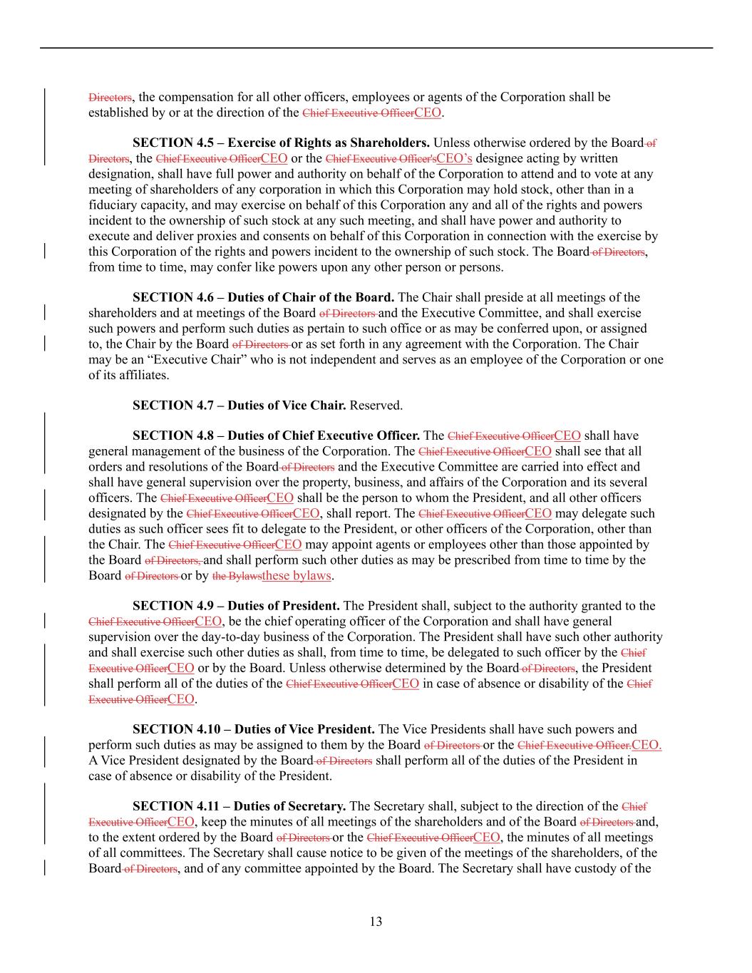 13 Directors, the compensation for all other officers, employees or agents of the Corporation shall be established by or at the direction of the Chief Executive OfficerCEO. SECTION 4.5 – Exercise of Rights as Shareholders. Unless otherwise ordered by the Board of Directors, the Chief Executive OfficerCEO or the Chief Executive Officer'sCEO’s designee acting by written designation, shall have full power and authority on behalf of the Corporation to attend and to vote at any meeting of shareholders of any corporation in which this Corporation may hold stock, other than in a fiduciary capacity, and may exercise on behalf of this Corporation any and all of the rights and powers incident to the ownership of such stock at any such meeting, and shall have power and authority to execute and deliver proxies and consents on behalf of this Corporation in connection with the exercise by this Corporation of the rights and powers incident to the ownership of such stock. The Board of Directors, from time to time, may confer like powers upon any other person or persons. SECTION 4.6 – Duties of Chair of the Board. The Chair shall preside at all meetings of the shareholders and at meetings of the Board of Directors and the Executive Committee, and shall exercise such powers and perform such duties as pertain to such office or as may be conferred upon, or assigned to, the Chair by the Board of Directors or as set forth in any agreement with the Corporation. The Chair may be an “Executive Chair” who is not independent and serves as an employee of the Corporation or one of its affiliates. SECTION 4.7 – Duties of Vice Chair. Reserved. SECTION 4.8 – Duties of Chief Executive Officer. The Chief Executive OfficerCEO shall have general management of the business of the Corporation. The Chief Executive OfficerCEO shall see that all orders and resolutions of the Board of Directors and the Executive Committee are carried into effect and shall have general supervision over the property, business, and affairs of the Corporation and its several officers. The Chief Executive OfficerCEO shall be the person to whom the President, and all other officers designated by the Chief Executive OfficerCEO, shall report. The Chief Executive OfficerCEO may delegate such duties as such officer sees fit to delegate to the President, or other officers of the Corporation, other than the Chair. The Chief Executive OfficerCEO may appoint agents or employees other than those appointed by the Board of Directors, and shall perform such other duties as may be prescribed from time to time by the Board of Directors or by the Bylawsthese bylaws. SECTION 4.9 – Duties of President. The President shall, subject to the authority granted to the Chief Executive OfficerCEO, be the chief operating officer of the Corporation and shall have general supervision over the day-to-day business of the Corporation. The President shall have such other authority and shall exercise such other duties as shall, from time to time, be delegated to such officer by the Chief Executive OfficerCEO or by the Board. Unless otherwise determined by the Board of Directors, the President shall perform all of the duties of the Chief Executive OfficerCEO in case of absence or disability of the Chief Executive OfficerCEO. SECTION 4.10 – Duties of Vice President. The Vice Presidents shall have such powers and perform such duties as may be assigned to them by the Board of Directors or the Chief Executive Officer.CEO. A Vice President designated by the Board of Directors shall perform all of the duties of the President in case of absence or disability of the President. SECTION 4.11 – Duties of Secretary. The Secretary shall, subject to the direction of the Chief Executive OfficerCEO, keep the minutes of all meetings of the shareholders and of the Board of Directors and, to the extent ordered by the Board of Directors or the Chief Executive OfficerCEO, the minutes of all meetings of all committees. The Secretary shall cause notice to be given of the meetings of the shareholders, of the Board of Directors, and of any committee appointed by the Board. The Secretary shall have custody of the