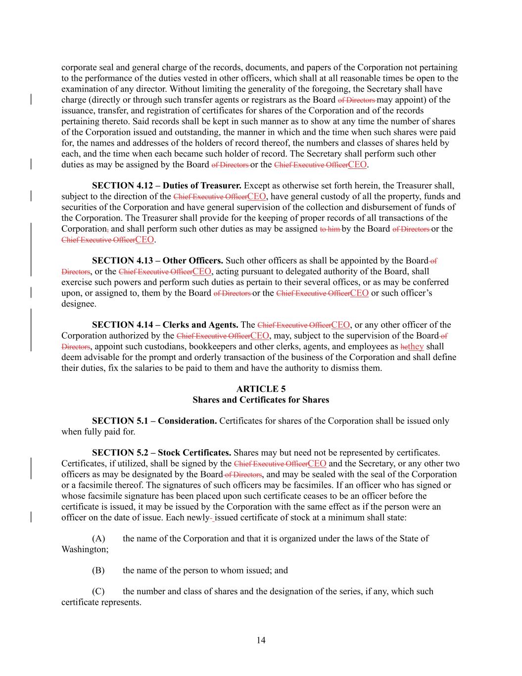 14 corporate seal and general charge of the records, documents, and papers of the Corporation not pertaining to the performance of the duties vested in other officers, which shall at all reasonable times be open to the examination of any director. Without limiting the generality of the foregoing, the Secretary shall have charge (directly or through such transfer agents or registrars as the Board of Directors may appoint) of the issuance, transfer, and registration of certificates for shares of the Corporation and of the records pertaining thereto. Said records shall be kept in such manner as to show at any time the number of shares of the Corporation issued and outstanding, the manner in which and the time when such shares were paid for, the names and addresses of the holders of record thereof, the numbers and classes of shares held by each, and the time when each became such holder of record. The Secretary shall perform such other duties as may be assigned by the Board of Directors or the Chief Executive OfficerCEO. SECTION 4.12 – Duties of Treasurer. Except as otherwise set forth herein, the Treasurer shall, subject to the direction of the Chief Executive OfficerCEO, have general custody of all the property, funds and securities of the Corporation and have general supervision of the collection and disbursement of funds of the Corporation. The Treasurer shall provide for the keeping of proper records of all transactions of the Corporation, and shall perform such other duties as may be assigned to him by the Board of Directors or the Chief Executive OfficerCEO. SECTION 4.13 – Other Officers. Such other officers as shall be appointed by the Board of Directors, or the Chief Executive OfficerCEO, acting pursuant to delegated authority of the Board, shall exercise such powers and perform such duties as pertain to their several offices, or as may be conferred upon, or assigned to, them by the Board of Directors or the Chief Executive OfficerCEO or such officer’s designee. SECTION 4.14 – Clerks and Agents. The Chief Executive OfficerCEO, or any other officer of the Corporation authorized by the Chief Executive OfficerCEO, may, subject to the supervision of the Board of Directors, appoint such custodians, bookkeepers and other clerks, agents, and employees as hethey shall deem advisable for the prompt and orderly transaction of the business of the Corporation and shall define their duties, fix the salaries to be paid to them and have the authority to dismiss them. ARTICLE 5 Shares and Certificates for Shares SECTION 5.1 – Consideration. Certificates for shares of the Corporation shall be issued only when fully paid for. SECTION 5.2 – Stock Certificates. Shares may but need not be represented by certificates. Certificates, if utilized, shall be signed by the Chief Executive OfficerCEO and the Secretary, or any other two officers as may be designated by the Board of Directors, and may be sealed with the seal of the Corporation or a facsimile thereof. The signatures of such officers may be facsimiles. If an officer who has signed or whose facsimile signature has been placed upon such certificate ceases to be an officer before the certificate is issued, it may be issued by the Corporation with the same effect as if the person were an officer on the date of issue. Each newly- issued certificate of stock at a minimum shall state: (A) the name of the Corporation and that it is organized under the laws of the State of Washington; (B) the name of the person to whom issued; and (C) the number and class of shares and the designation of the series, if any, which such certificate represents.