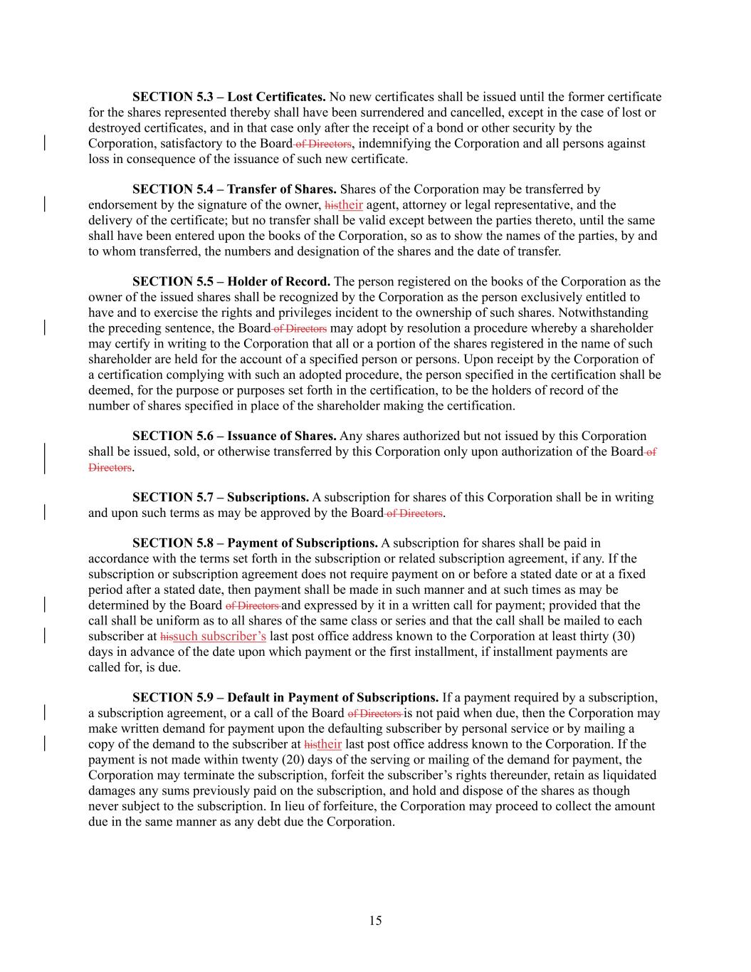15 SECTION 5.3 – Lost Certificates. No new certificates shall be issued until the former certificate for the shares represented thereby shall have been surrendered and cancelled, except in the case of lost or destroyed certificates, and in that case only after the receipt of a bond or other security by the Corporation, satisfactory to the Board of Directors, indemnifying the Corporation and all persons against loss in consequence of the issuance of such new certificate. SECTION 5.4 – Transfer of Shares. Shares of the Corporation may be transferred by endorsement by the signature of the owner, histheir agent, attorney or legal representative, and the delivery of the certificate; but no transfer shall be valid except between the parties thereto, until the same shall have been entered upon the books of the Corporation, so as to show the names of the parties, by and to whom transferred, the numbers and designation of the shares and the date of transfer. SECTION 5.5 – Holder of Record. The person registered on the books of the Corporation as the owner of the issued shares shall be recognized by the Corporation as the person exclusively entitled to have and to exercise the rights and privileges incident to the ownership of such shares. Notwithstanding the preceding sentence, the Board of Directors may adopt by resolution a procedure whereby a shareholder may certify in writing to the Corporation that all or a portion of the shares registered in the name of such shareholder are held for the account of a specified person or persons. Upon receipt by the Corporation of a certification complying with such an adopted procedure, the person specified in the certification shall be deemed, for the purpose or purposes set forth in the certification, to be the holders of record of the number of shares specified in place of the shareholder making the certification. SECTION 5.6 – Issuance of Shares. Any shares authorized but not issued by this Corporation shall be issued, sold, or otherwise transferred by this Corporation only upon authorization of the Board of Directors. SECTION 5.7 – Subscriptions. A subscription for shares of this Corporation shall be in writing and upon such terms as may be approved by the Board of Directors. SECTION 5.8 – Payment of Subscriptions. A subscription for shares shall be paid in accordance with the terms set forth in the subscription or related subscription agreement, if any. If the subscription or subscription agreement does not require payment on or before a stated date or at a fixed period after a stated date, then payment shall be made in such manner and at such times as may be determined by the Board of Directors and expressed by it in a written call for payment; provided that the call shall be uniform as to all shares of the same class or series and that the call shall be mailed to each subscriber at hissuch subscriber’s last post office address known to the Corporation at least thirty (30) days in advance of the date upon which payment or the first installment, if installment payments are called for, is due. SECTION 5.9 – Default in Payment of Subscriptions. If a payment required by a subscription, a subscription agreement, or a call of the Board of Directors is not paid when due, then the Corporation may make written demand for payment upon the defaulting subscriber by personal service or by mailing a copy of the demand to the subscriber at histheir last post office address known to the Corporation. If the payment is not made within twenty (20) days of the serving or mailing of the demand for payment, the Corporation may terminate the subscription, forfeit the subscriber’s rights thereunder, retain as liquidated damages any sums previously paid on the subscription, and hold and dispose of the shares as though never subject to the subscription. In lieu of forfeiture, the Corporation may proceed to collect the amount due in the same manner as any debt due the Corporation.
