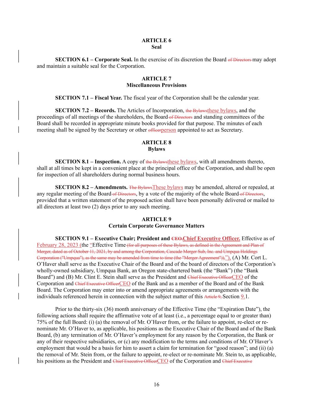16 ARTICLE 6 Seal SECTION 6.1 – Corporate Seal. In the exercise of its discretion the Board of Directors may adopt and maintain a suitable seal for the Corporation. ARTICLE 7 Miscellaneous Provisions SECTION 7.1 – Fiscal Year. The fiscal year of the Corporation shall be the calendar year. SECTION 7.2 – Records. The Articles of Incorporation, the Bylawsthese bylaws, and the proceedings of all meetings of the shareholders, the Board of Directors and standing committees of the Board shall be recorded in appropriate minute books provided for that purpose. The minutes of each meeting shall be signed by the Secretary or other officerperson appointed to act as Secretary. ARTICLE 8 Bylaws SECTION 8.1 – Inspection. A copy of the Bylawsthese bylaws, with all amendments thereto, shall at all times be kept in a convenient place at the principal office of the Corporation, and shall be open for inspection of all shareholders during normal business hours. SECTION 8.2 – Amendments. The BylawsThese bylaws may be amended, altered or repealed, at any regular meeting of the Board of Directors, by a vote of the majority of the whole Board of Directors, provided that a written statement of the proposed action shall have been personally delivered or mailed to all directors at least two (2) days prior to any such meeting. ARTICLE 9 Certain Corporate Governance Matters SECTION 9.1 – Executive Chair; President and CEO.Chief Executive Officer. Effective as of February 28, 2023 (the “Effective Time (for all purposes of these Bylaws, as defined in the Agreement and Plan of Merger, dated as of October 11, 2021, by and among the Corporation, Cascade Merger Sub, Inc. and Umpqua Holdings Corporation ("Umpqua"), as the same may be amended from time to time (the "Merger Agreement")),”), (A) Mr. Cort L. O’Haver shall serve as the Executive Chair of the Board and of the board of directors of the Corporation’s wholly-owned subsidiary, Umpqua Bank, an Oregon state-chartered bank (the “Bank”) (the “Bank Board”) and (B) Mr. Clint E. Stein shall serve as the President and Chief Executive OfficerCEO of the Corporation and Chief Executive OfficerCEO of the Bank and as a member of the Board and of the Bank Board. The Corporation may enter into or amend appropriate agreements or arrangements with the individuals referenced herein in connection with the subject matter of this Article 9, Section 9.1. Prior to the thirty-six (36) month anniversary of the Effective Time (the “Expiration Date”), the following actions shall require the affirmative vote of at least (i.e., a percentage equal to or greater than) 75% of the full Board: (i) (a) the removal of Mr. O’Haver from, or the failure to appoint, re-elect or re- nominate Mr. O’Haver to, as applicable, his positions as the Executive Chair of the Board and of the Bank Board, (b) any termination of Mr. O’Haver’s employment for any reason by the Corporation, the Bank or any of their respective subsidiaries, or (c) any modification to the terms and conditions of Mr. O’Haver’s employment that would be a basis for him to assert a claim for termination for “good reason”; and (ii) (a) the removal of Mr. Stein from, or the failure to appoint, re-elect or re-nominate Mr. Stein to, as applicable, his positions as the President and Chief Executive OfficerCEO of the Corporation and Chief Executive