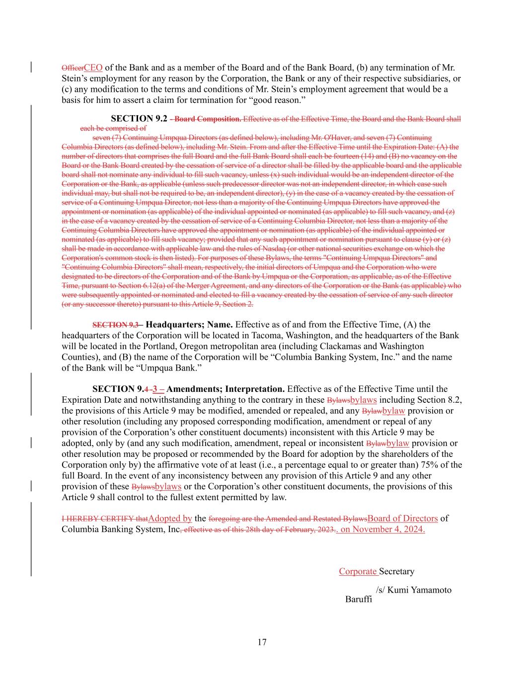 17 OfficerCEO of the Bank and as a member of the Board and of the Bank Board, (b) any termination of Mr. Stein’s employment for any reason by the Corporation, the Bank or any of their respective subsidiaries, or (c) any modification to the terms and conditions of Mr. Stein’s employment agreement that would be a basis for him to assert a claim for termination for “good reason.” SECTION 9.2 - Board Composition. Effective as of the Effective Time, the Board and the Bank Board shall each be comprised of seven (7) Continuing Umpqua Directors (as defined below), including Mr. O'Haver, and seven (7) Continuing Columbia Directors (as defined below), including Mr. Stein. From and after the Effective Time until the Expiration Date: (A) the number of directors that comprises the full Board and the full Bank Board shall each be fourteen (14) and (B) no vacancy on the Board or the Bank Board created by the cessation of service of a director shall be filled by the applicable board and the applicable board shall not nominate any individual to fill such vacancy, unless (x) such individual would be an independent director of the Corporation or the Bank, as applicable (unless such predecessor director was not an independent director, in which case such individual may, but shall not be required to be, an independent director), (y) in the case of a vacancy created by the cessation of service of a Continuing Umpqua Director, not less than a majority of the Continuing Umpqua Directors have approved the appointment or nomination (as applicable) of the individual appointed or nominated (as applicable) to fill such vacancy, and (z) in the case of a vacancy created by the cessation of service of a Continuing Columbia Director, not less than a majority of the Continuing Columbia Directors have approved the appointment or nomination (as applicable) of the individual appointed or nominated (as applicable) to fill such vacancy; provided that any such appointment or nomination pursuant to clause (y) or (z) shall be made in accordance with applicable law and the rules of Nasdaq (or other national securities exchange on which the Corporation's common stock is then listed). For purposes of these Bylaws, the terms "Continuing Umpqua Directors" and "Continuing Columbia Directors" shall mean, respectively, the initial directors of Umpqua and the Corporation who were designated to be directors of the Corporation and of the Bank by Umpqua or the Corporation, as applicable, as of the Effective Time, pursuant to Section 6.12(a) of the Merger Agreement, and any directors of the Corporation or the Bank (as applicable) who were subsequently appointed or nominated and elected to fill a vacancy created by the cessation of service of any such director (or any successor thereto) pursuant to this Article 9, Section 2. SECTION 9.3– Headquarters; Name. Effective as of and from the Effective Time, (A) the headquarters of the Corporation will be located in Tacoma, Washington, and the headquarters of the Bank will be located in the Portland, Oregon metropolitan area (including Clackamas and Washington Counties), and (B) the name of the Corporation will be “Columbia Banking System, Inc.” and the name of the Bank will be “Umpqua Bank.” SECTION 9.4 -3 – Amendments; Interpretation. Effective as of the Effective Time until the Expiration Date and notwithstanding anything to the contrary in these Bylawsbylaws including Section 8.2, the provisions of this Article 9 may be modified, amended or repealed, and any Bylawbylaw provision or other resolution (including any proposed corresponding modification, amendment or repeal of any provision of the Corporation’s other constituent documents) inconsistent with this Article 9 may be adopted, only by (and any such modification, amendment, repeal or inconsistent Bylawbylaw provision or other resolution may be proposed or recommended by the Board for adoption by the shareholders of the Corporation only by) the affirmative vote of at least (i.e., a percentage equal to or greater than) 75% of the full Board. In the event of any inconsistency between any provision of this Article 9 and any other provision of these Bylawsbylaws or the Corporation’s other constituent documents, the provisions of this Article 9 shall control to the fullest extent permitted by law. I HEREBY CERTIFY thatAdopted by the foregoing are the Amended and Restated BylawsBoard of Directors of Columbia Banking System, Inc, effective as of this 28th day of February, 2023.. on November 4, 2024. Corporate Secretary /s/ Kumi Yamamoto Baruffi