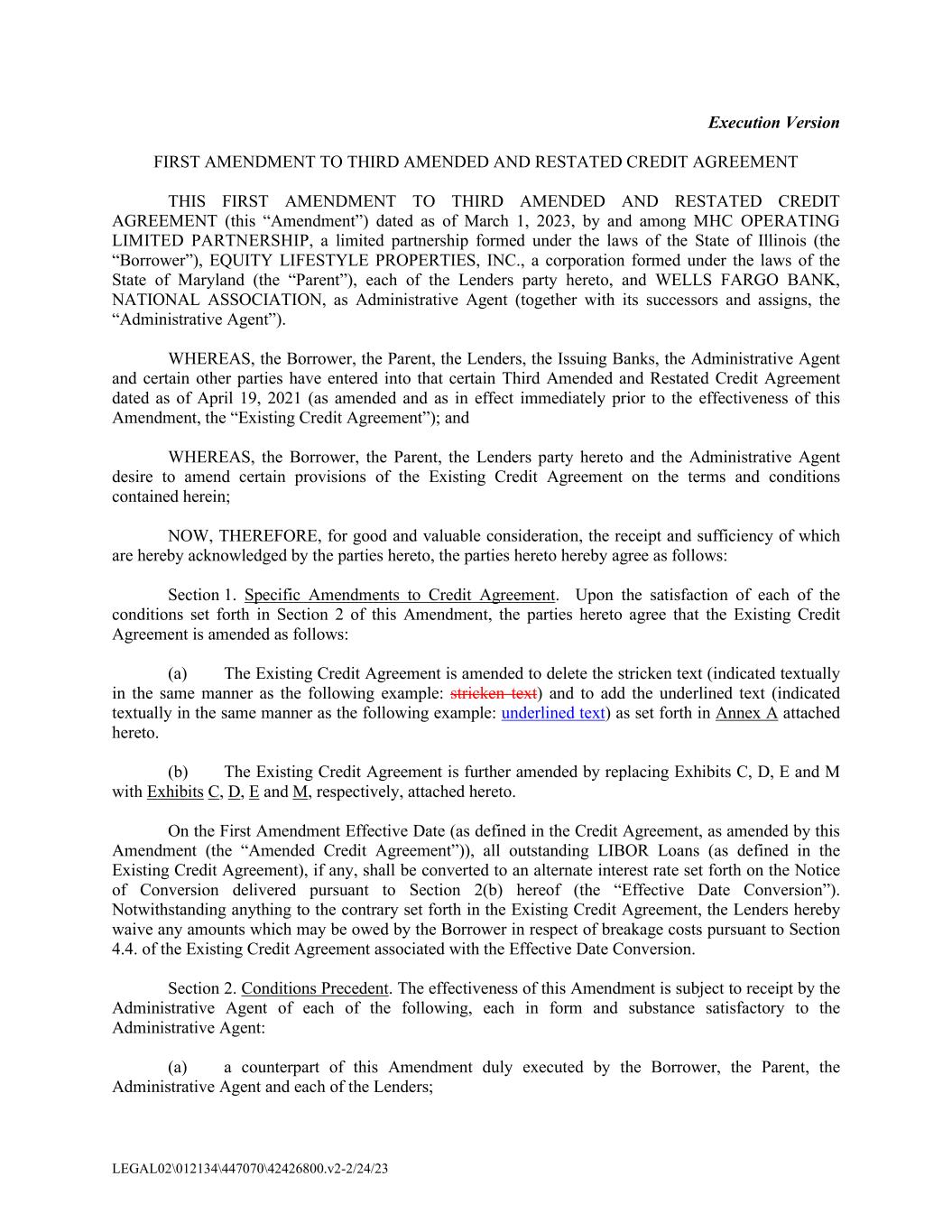 LEGAL02\012134\447070\42426800.v2-2/24/23 Execution Version FIRST AMENDMENT TO THIRD AMENDED AND RESTATED CREDIT AGREEMENT THIS FIRST AMENDMENT TO THIRD AMENDED AND RESTATED CREDIT AGREEMENT (this “Amendment”) dated as of March 1, 2023, by and among MHC OPERATING LIMITED PARTNERSHIP, a limited partnership formed under the laws of the State of Illinois (the “Borrower”), EQUITY LIFESTYLE PROPERTIES, INC., a corporation formed under the laws of the State of Maryland (the “Parent”), each of the Lenders party hereto, and WELLS FARGO BANK, NATIONAL ASSOCIATION, as Administrative Agent (together with its successors and assigns, the “Administrative Agent”). WHEREAS, the Borrower, the Parent, the Lenders, the Issuing Banks, the Administrative Agent and certain other parties have entered into that certain Third Amended and Restated Credit Agreement dated as of April 19, 2021 (as amended and as in effect immediately prior to the effectiveness of this Amendment, the “Existing Credit Agreement”); and WHEREAS, the Borrower, the Parent, the Lenders party hereto and the Administrative Agent desire to amend certain provisions of the Existing Credit Agreement on the terms and conditions contained herein; NOW, THEREFORE, for good and valuable consideration, the receipt and sufficiency of which are hereby acknowledged by the parties hereto, the parties hereto hereby agree as follows: Section 1. Specific Amendments to Credit Agreement. Upon the satisfaction of each of the conditions set forth in Section 2 of this Amendment, the parties hereto agree that the Existing Credit Agreement is amended as follows: (a) The Existing Credit Agreement is amended to delete the stricken text (indicated textually in the same manner as the following example: stricken text) and to add the underlined text (indicated textually in the same manner as the following example: underlined text) as set forth in Annex A attached hereto. (b) The Existing Credit Agreement is further amended by replacing Exhibits C, D, E and M with Exhibits C, D, E and M, respectively, attached hereto. On the First Amendment Effective Date (as defined in the Credit Agreement, as amended by this Amendment (the “Amended Credit Agreement”)), all outstanding LIBOR Loans (as defined in the Existing Credit Agreement), if any, shall be converted to an alternate interest rate set forth on the Notice of Conversion delivered pursuant to Section 2(b) hereof (the “Effective Date Conversion”). Notwithstanding anything to the contrary set forth in the Existing Credit Agreement, the Lenders hereby waive any amounts which may be owed by the Borrower in respect of breakage costs pursuant to Section 4.4. of the Existing Credit Agreement associated with the Effective Date Conversion. Section 2. Conditions Precedent. The effectiveness of this Amendment is subject to receipt by the Administrative Agent of each of the following, each in form and substance satisfactory to the Administrative Agent: (a) a counterpart of this Amendment duly executed by the Borrower, the Parent, the Administrative Agent and each of the Lenders;