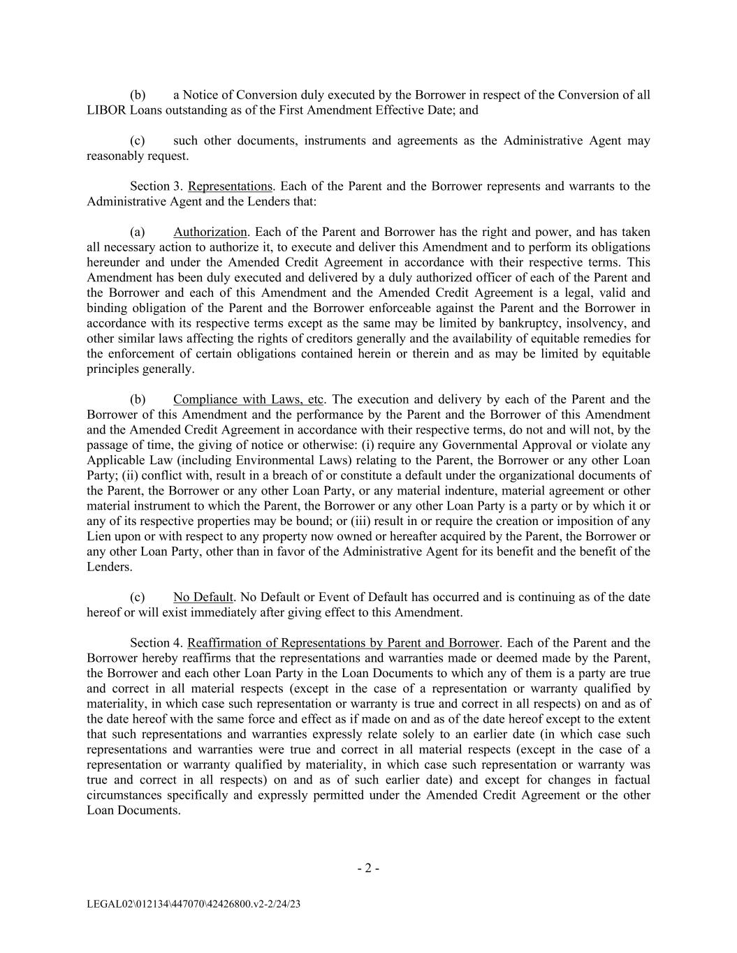 - 2 - LEGAL02\012134\447070\42426800.v2-2/24/23 (b) a Notice of Conversion duly executed by the Borrower in respect of the Conversion of all LIBOR Loans outstanding as of the First Amendment Effective Date; and (c) such other documents, instruments and agreements as the Administrative Agent may reasonably request. Section 3. Representations. Each of the Parent and the Borrower represents and warrants to the Administrative Agent and the Lenders that: (a) Authorization. Each of the Parent and Borrower has the right and power, and has taken all necessary action to authorize it, to execute and deliver this Amendment and to perform its obligations hereunder and under the Amended Credit Agreement in accordance with their respective terms. This Amendment has been duly executed and delivered by a duly authorized officer of each of the Parent and the Borrower and each of this Amendment and the Amended Credit Agreement is a legal, valid and binding obligation of the Parent and the Borrower enforceable against the Parent and the Borrower in accordance with its respective terms except as the same may be limited by bankruptcy, insolvency, and other similar laws affecting the rights of creditors generally and the availability of equitable remedies for the enforcement of certain obligations contained herein or therein and as may be limited by equitable principles generally. (b) Compliance with Laws, etc. The execution and delivery by each of the Parent and the Borrower of this Amendment and the performance by the Parent and the Borrower of this Amendment and the Amended Credit Agreement in accordance with their respective terms, do not and will not, by the passage of time, the giving of notice or otherwise: (i) require any Governmental Approval or violate any Applicable Law (including Environmental Laws) relating to the Parent, the Borrower or any other Loan Party; (ii) conflict with, result in a breach of or constitute a default under the organizational documents of the Parent, the Borrower or any other Loan Party, or any material indenture, material agreement or other material instrument to which the Parent, the Borrower or any other Loan Party is a party or by which it or any of its respective properties may be bound; or (iii) result in or require the creation or imposition of any Lien upon or with respect to any property now owned or hereafter acquired by the Parent, the Borrower or any other Loan Party, other than in favor of the Administrative Agent for its benefit and the benefit of the Lenders. (c) No Default. No Default or Event of Default has occurred and is continuing as of the date hereof or will exist immediately after giving effect to this Amendment. Section 4. Reaffirmation of Representations by Parent and Borrower. Each of the Parent and the Borrower hereby reaffirms that the representations and warranties made or deemed made by the Parent, the Borrower and each other Loan Party in the Loan Documents to which any of them is a party are true and correct in all material respects (except in the case of a representation or warranty qualified by materiality, in which case such representation or warranty is true and correct in all respects) on and as of the date hereof with the same force and effect as if made on and as of the date hereof except to the extent that such representations and warranties expressly relate solely to an earlier date (in which case such representations and warranties were true and correct in all material respects (except in the case of a representation or warranty qualified by materiality, in which case such representation or warranty was true and correct in all respects) on and as of such earlier date) and except for changes in factual circumstances specifically and expressly permitted under the Amended Credit Agreement or the other Loan Documents.