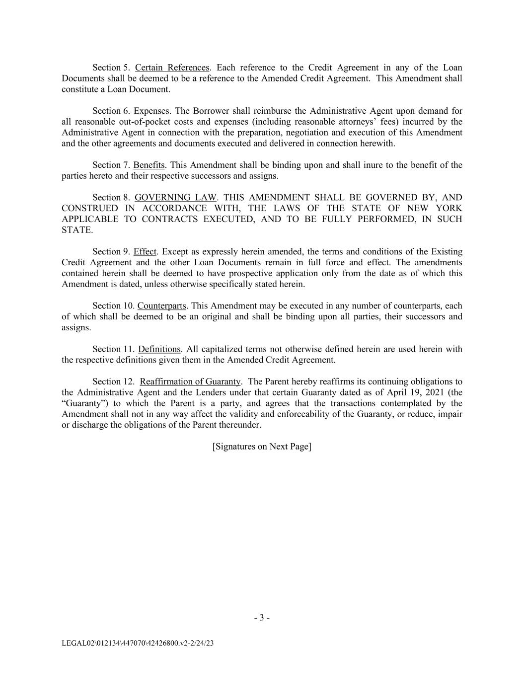 - 3 - LEGAL02\012134\447070\42426800.v2-2/24/23 Section 5. Certain References. Each reference to the Credit Agreement in any of the Loan Documents shall be deemed to be a reference to the Amended Credit Agreement. This Amendment shall constitute a Loan Document. Section 6. Expenses. The Borrower shall reimburse the Administrative Agent upon demand for all reasonable out-of-pocket costs and expenses (including reasonable attorneys’ fees) incurred by the Administrative Agent in connection with the preparation, negotiation and execution of this Amendment and the other agreements and documents executed and delivered in connection herewith. Section 7. Benefits. This Amendment shall be binding upon and shall inure to the benefit of the parties hereto and their respective successors and assigns. Section 8. GOVERNING LAW. THIS AMENDMENT SHALL BE GOVERNED BY, AND CONSTRUED IN ACCORDANCE WITH, THE LAWS OF THE STATE OF NEW YORK APPLICABLE TO CONTRACTS EXECUTED, AND TO BE FULLY PERFORMED, IN SUCH STATE. Section 9. Effect. Except as expressly herein amended, the terms and conditions of the Existing Credit Agreement and the other Loan Documents remain in full force and effect. The amendments contained herein shall be deemed to have prospective application only from the date as of which this Amendment is dated, unless otherwise specifically stated herein. Section 10. Counterparts. This Amendment may be executed in any number of counterparts, each of which shall be deemed to be an original and shall be binding upon all parties, their successors and assigns. Section 11. Definitions. All capitalized terms not otherwise defined herein are used herein with the respective definitions given them in the Amended Credit Agreement. Section 12. Reaffirmation of Guaranty. The Parent hereby reaffirms its continuing obligations to the Administrative Agent and the Lenders under that certain Guaranty dated as of April 19, 2021 (the “Guaranty”) to which the Parent is a party, and agrees that the transactions contemplated by the Amendment shall not in any way affect the validity and enforceability of the Guaranty, or reduce, impair or discharge the obligations of the Parent thereunder. [Signatures on Next Page]