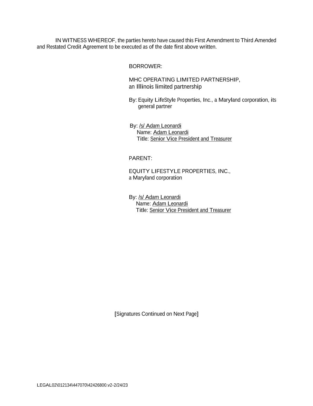 LEGAL02\012134\447070\42426800.v2-2/24/23 IN WITNESS WHEREOF, the parties hereto have caused this First Amendment to Third Amended and Restated Credit Agreement to be executed as of the date first above written. BORROWER: MHC OPERATING LIMITED PARTNERSHIP, an Illinois limited partnership By: Equity LifeStyle Properties, Inc., a Maryland corporation, its general partner By: /s/ Adam Leonardi Name: Adam Leonardi Title: Senior Vice President and Treasurer PARENT: EQUITY LIFESTYLE PROPERTIES, INC., a Maryland corporation By: /s/ Adam Leonardi Name: Adam Leonardi Title: Senior Vice President and Treasurer [Signatures Continued on Next Page]