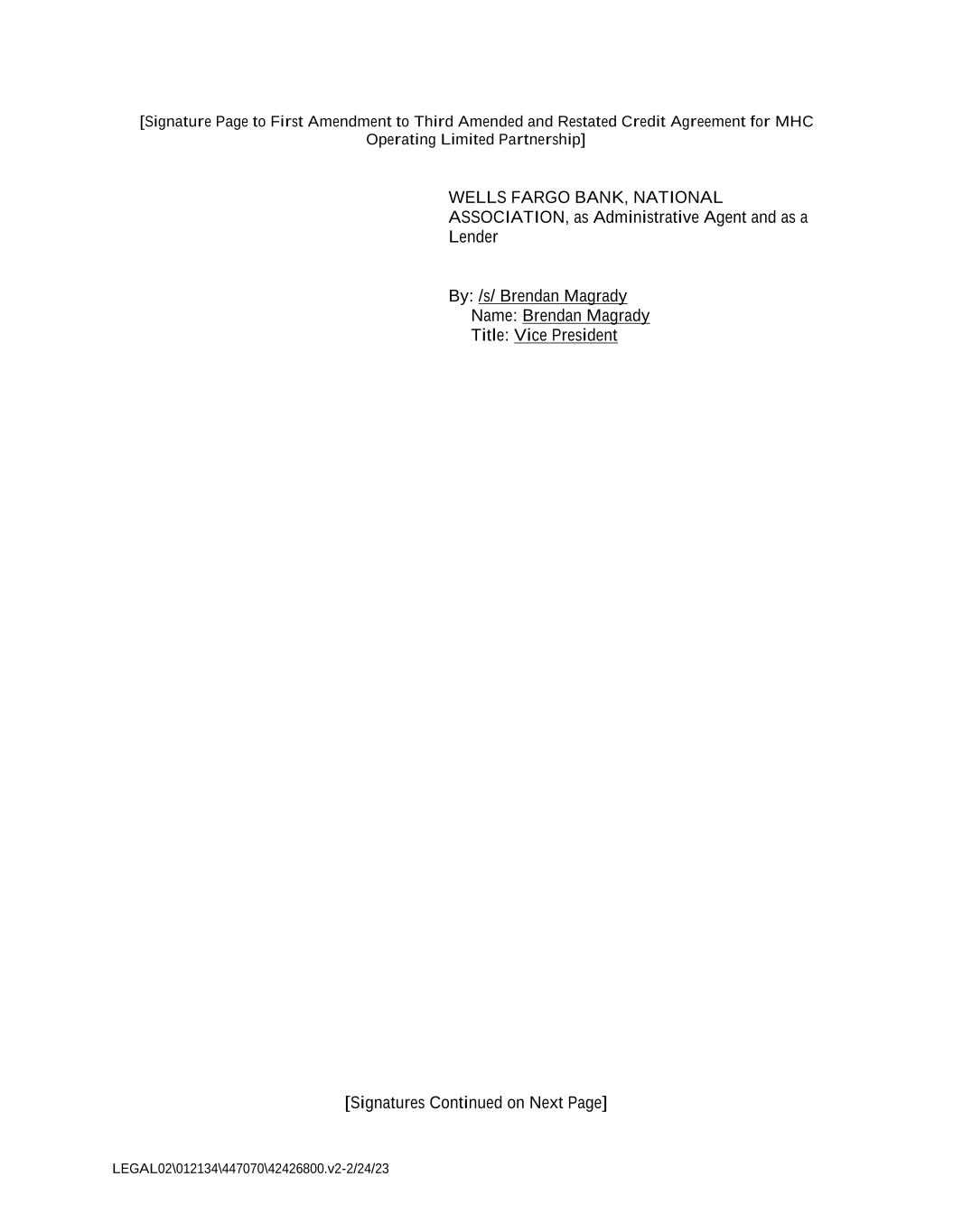 LEGAL02\012134\447070\42426800.v2-2/24/23 [Signature Page to First Amendment to Third Amended and Restated Credit Agreement for MHC Operating Limited Partnership] WELLS FARGO BANK, NATIONAL ASSOCIATION, as Administrative Agent and as a Lender By: /s/ Brendan Magrady Name: Brendan Magrady Title: Vice President [Signatures Continued on Next Page]