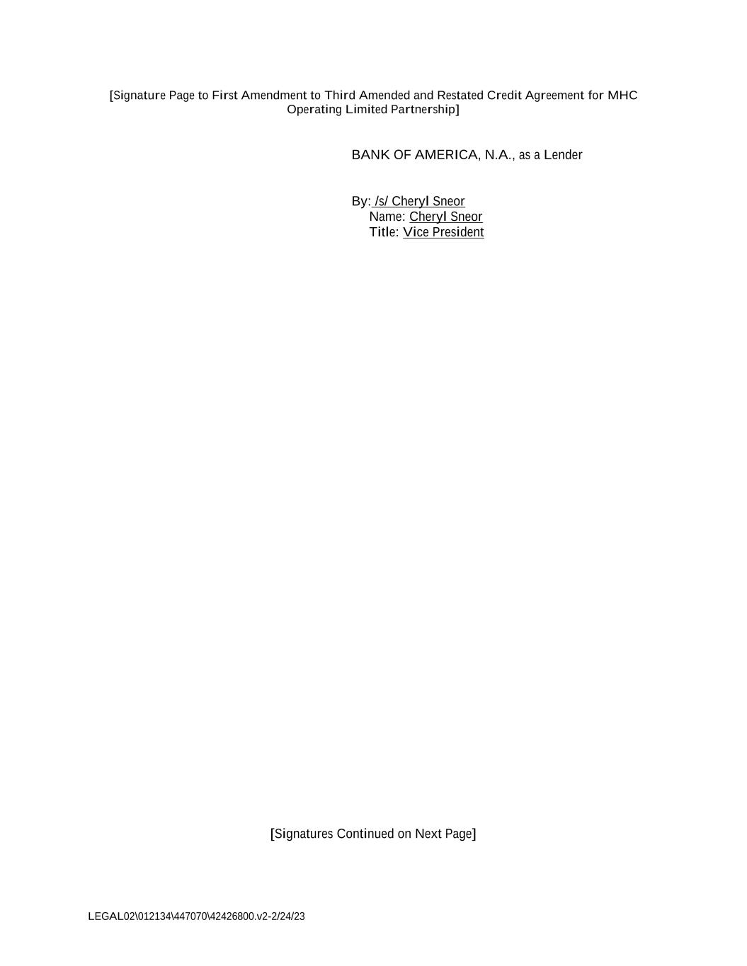LEGAL02\012134\447070\42426800.v2-2/24/23 [Signature Page to First Amendment to Third Amended and Restated Credit Agreement for MHC Operating Limited Partnership] BANK OF AMERICA, N.A., as a Lender By: /s/ Cheryl Sneor Name: Cheryl Sneor Title: Vice President [Signatures Continued on Next Page]