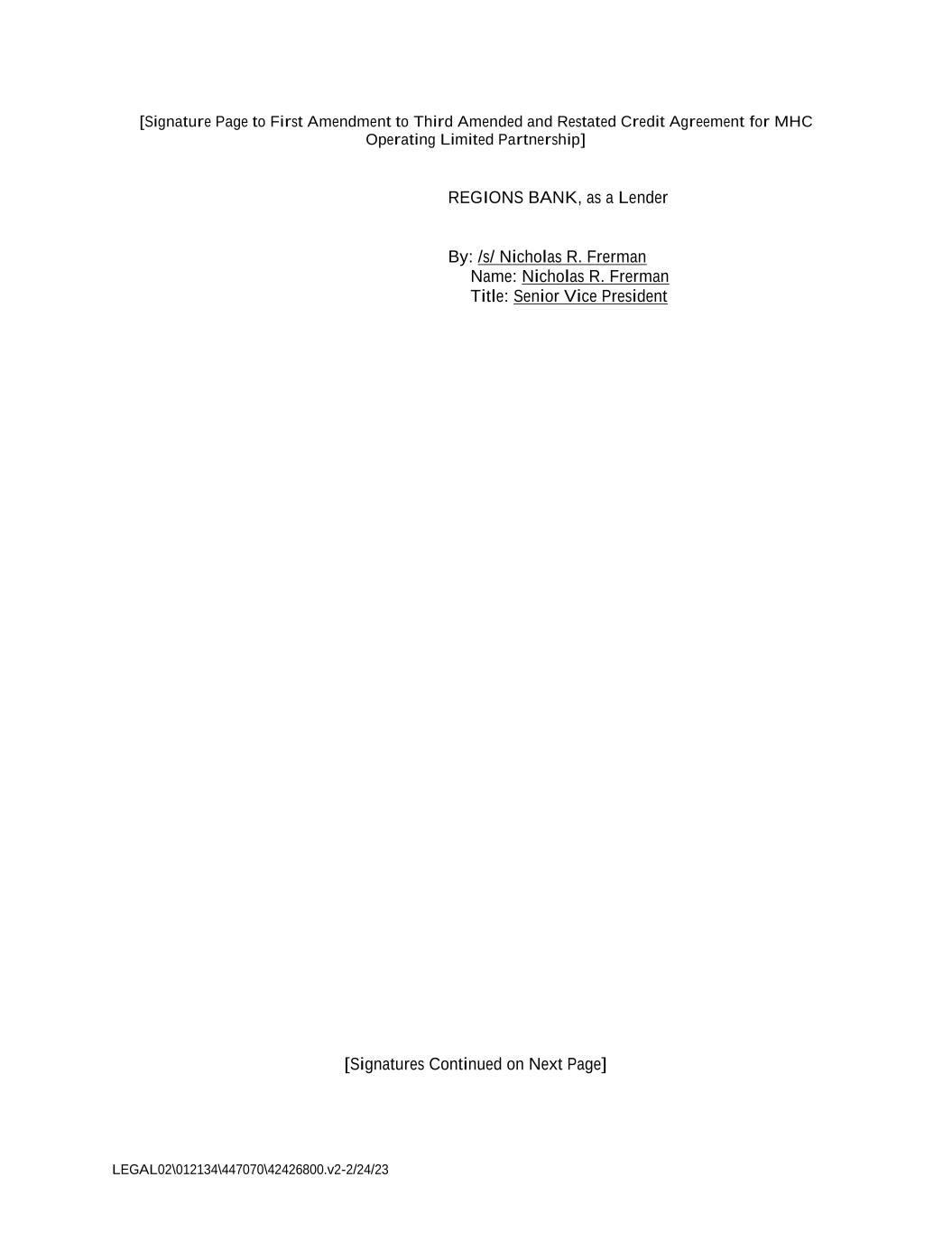 LEGAL02\012134\447070\42426800.v2-2/24/23 [Signature Page to First Amendment to Third Amended and Restated Credit Agreement for MHC Operating Limited Partnership] REGIONS BANK, as a Lender By: /s/ Nicholas R. Frerman Name: Nicholas R. Frerman Title: Senior Vice President [Signatures Continued on Next Page]