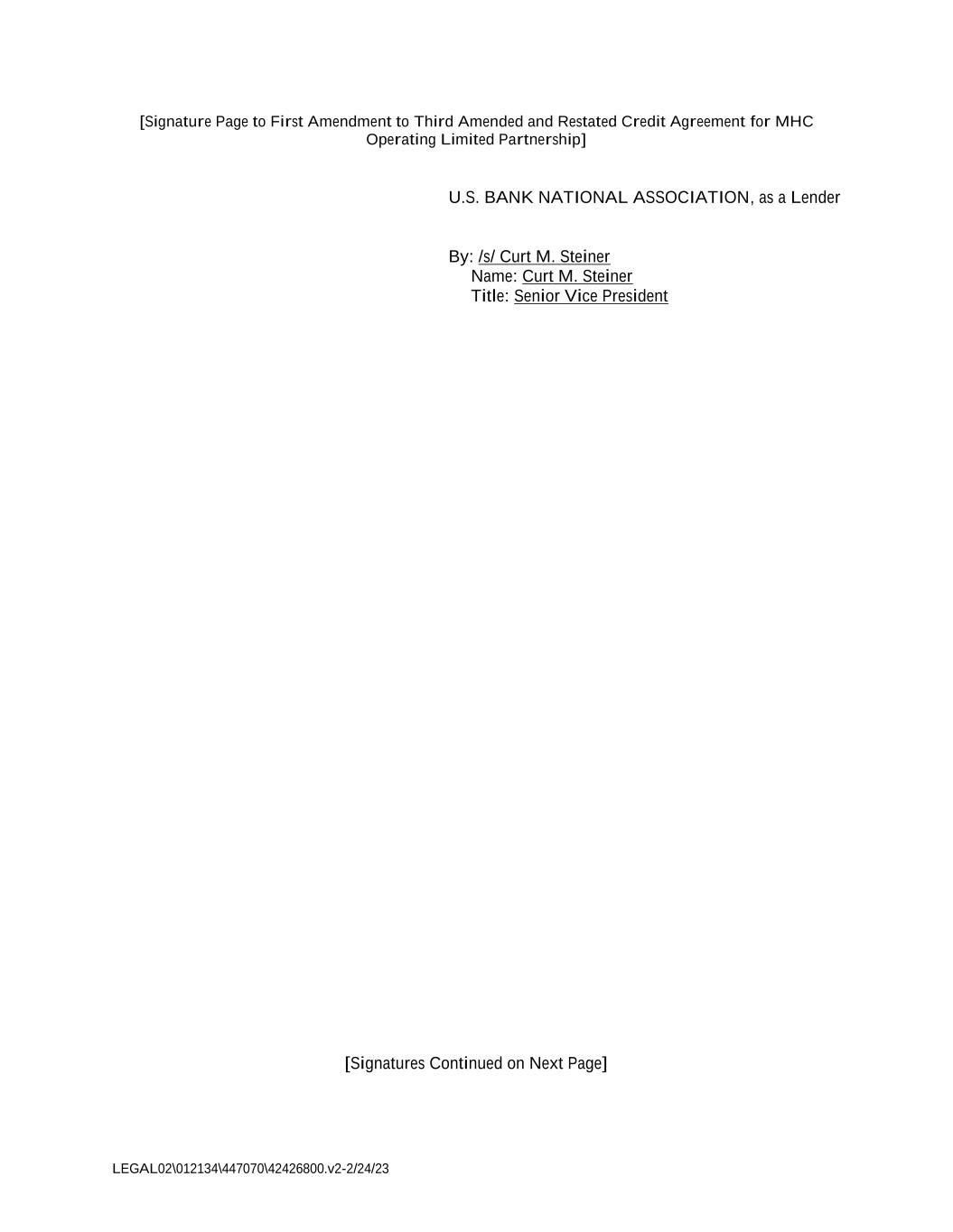 LEGAL02\012134\447070\42426800.v2-2/24/23 [Signature Page to First Amendment to Third Amended and Restated Credit Agreement for MHC Operating Limited Partnership] U.S. BANK NATIONAL ASSOCIATION, as a Lender By: /s/ Curt M. Steiner Name: Curt M. Steiner Title: Senior Vice President [Signatures Continued on Next Page]