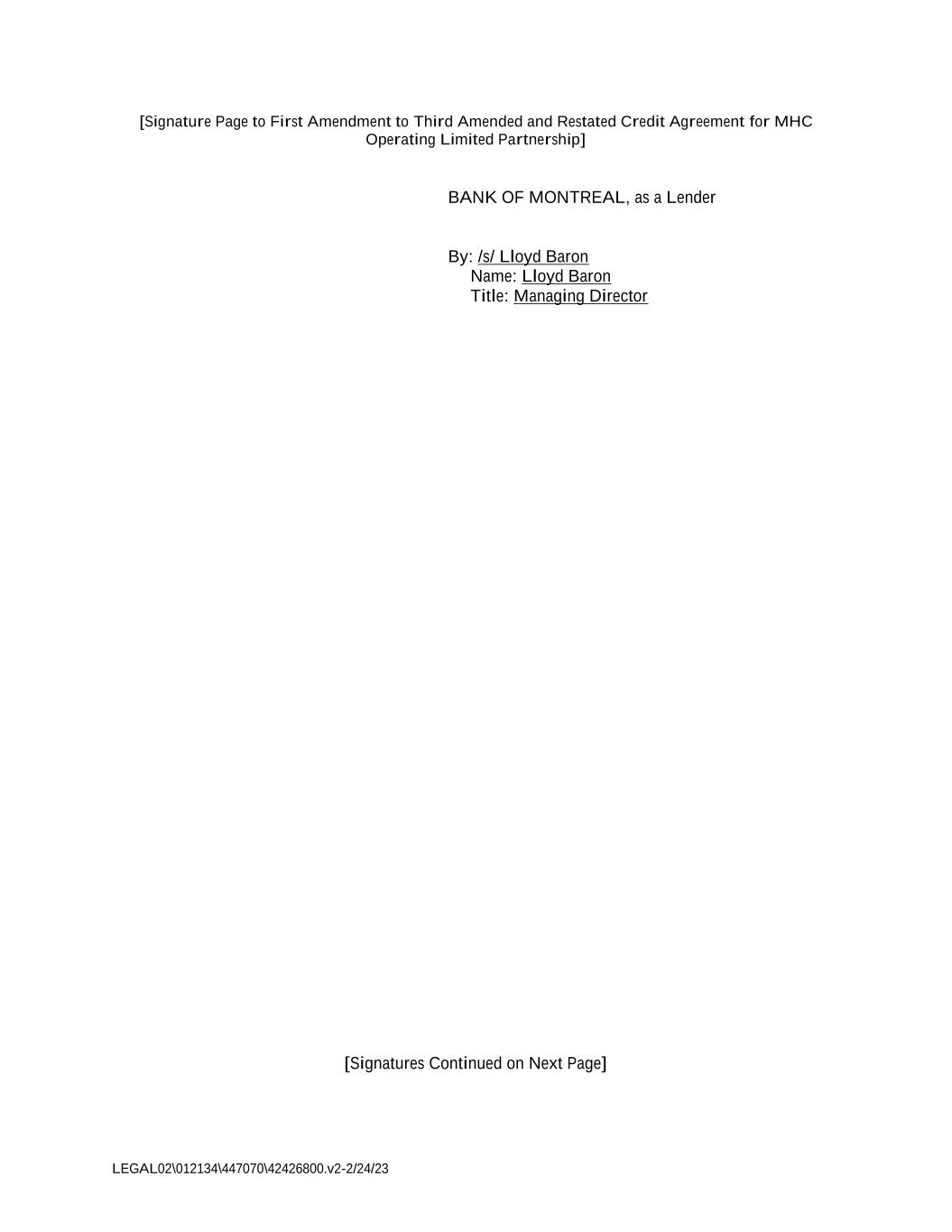 LEGAL02\012134\447070\42426800.v2-2/24/23 [Signature Page to First Amendment to Third Amended and Restated Credit Agreement for MHC Operating Limited Partnership] BANK OF MONTREAL, as a Lender By: /s/ Lloyd Baron Name: Lloyd Baron Title: Managing Director [Signatures Continued on Next Page]