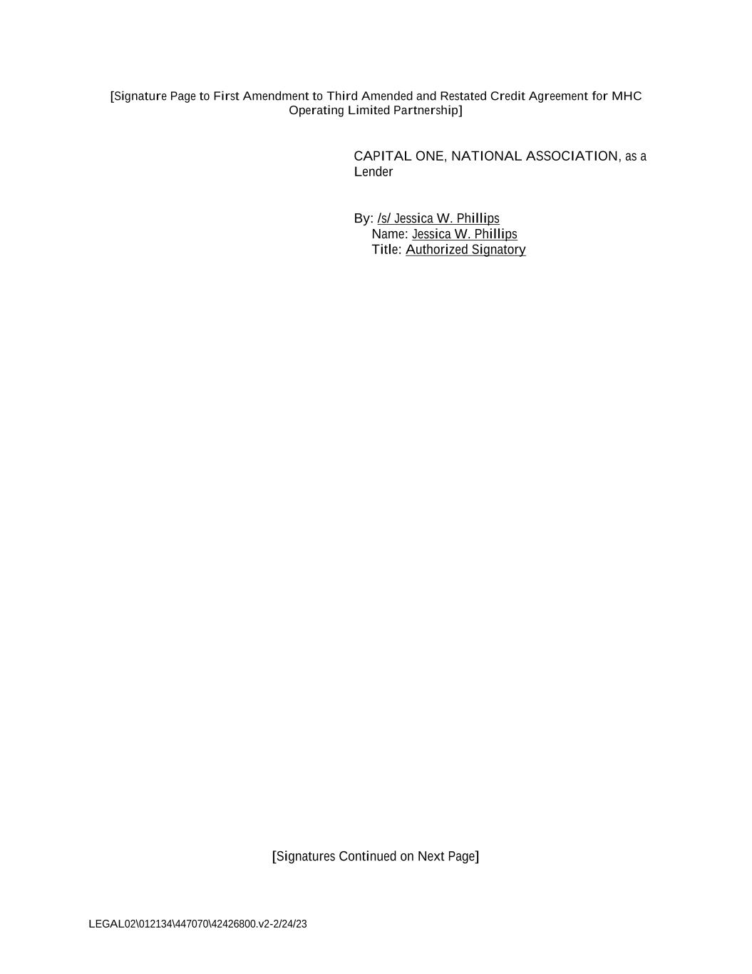 LEGAL02\012134\447070\42426800.v2-2/24/23 [Signature Page to First Amendment to Third Amended and Restated Credit Agreement for MHC Operating Limited Partnership] CAPITAL ONE, NATIONAL ASSOCIATION, as a Lender By: /s/ Jessica W. Phillips Name: Jessica W. Phillips Title: Authorized Signatory [Signatures Continued on Next Page]