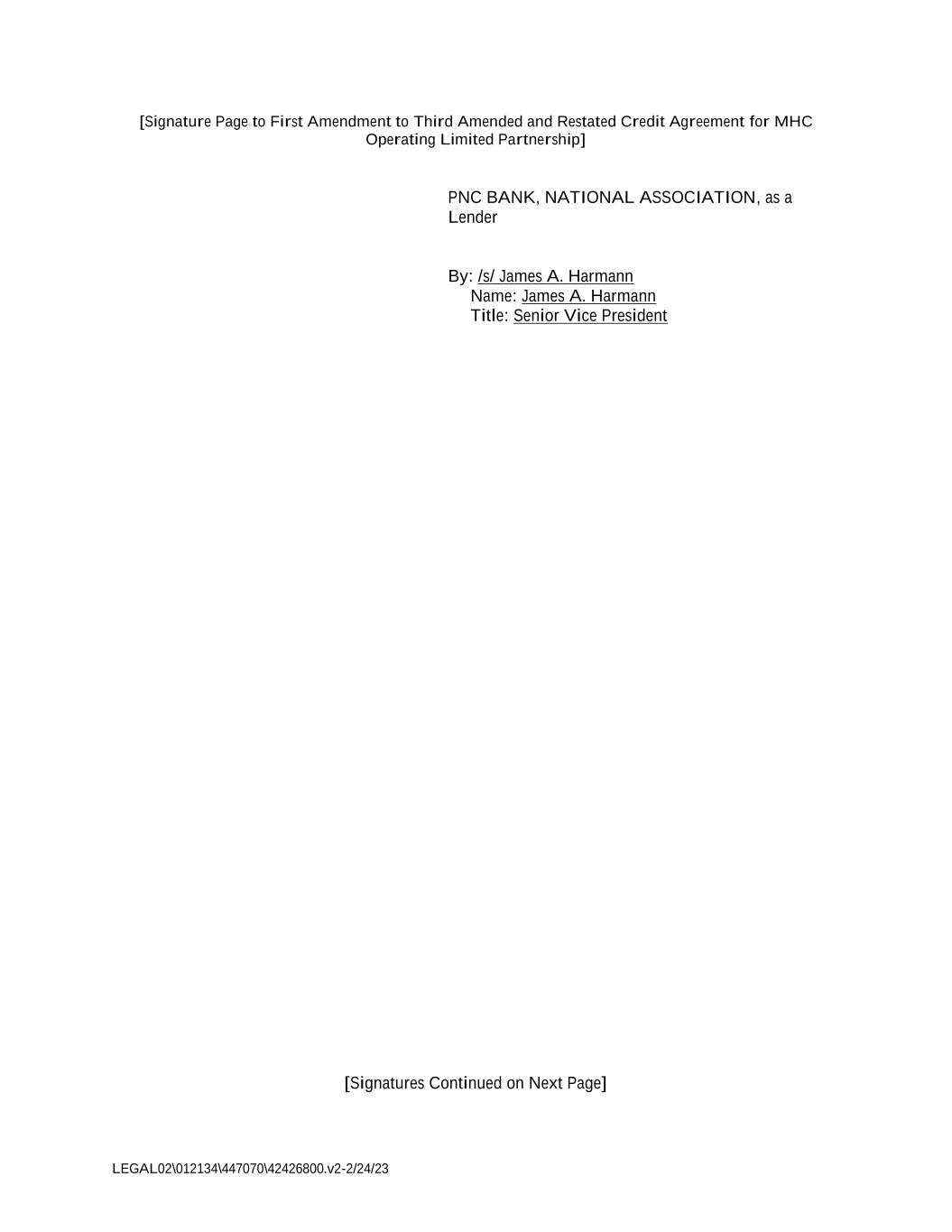LEGAL02\012134\447070\42426800.v2-2/24/23 [Signature Page to First Amendment to Third Amended and Restated Credit Agreement for MHC Operating Limited Partnership] PNC BANK, NATIONAL ASSOCIATION, as a Lender By: /s/ James A. Harmann Name: James A. Harmann Title: Senior Vice President [Signatures Continued on Next Page]