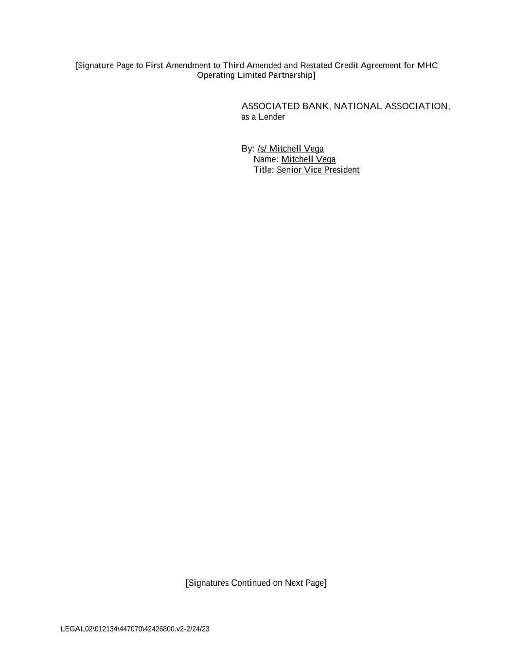 LEGAL02\012134\447070\42426800.v2-2/24/23 [Signature Page to First Amendment to Third Amended and Restated Credit Agreement for MHC Operating Limited Partnership] ASSOCIATED BANK, NATIONAL ASSOCIATION, as a Lender By: /s/ Mitchell Vega Name: Mitchell Vega Title: Senior Vice President [Signatures Continued on Next Page]