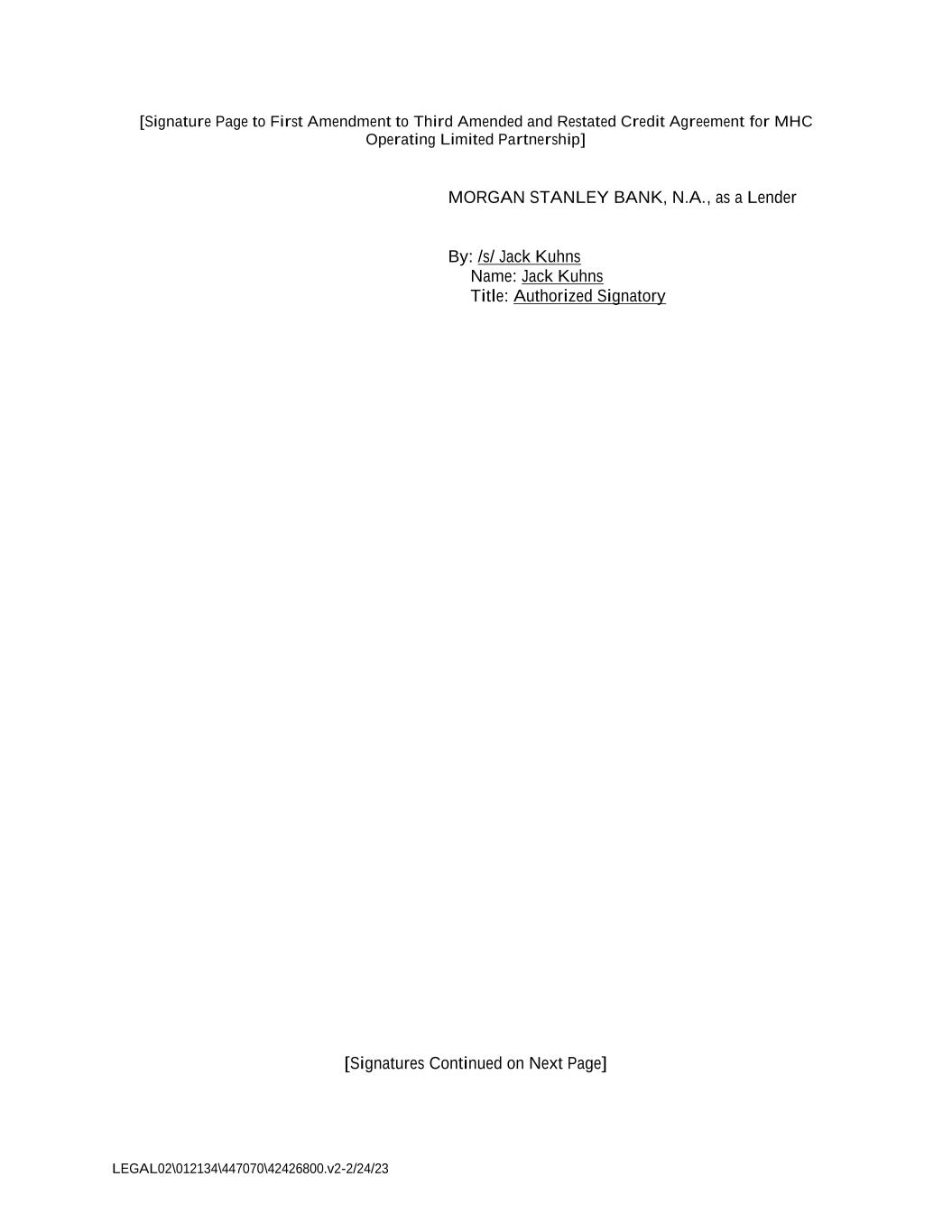 LEGAL02\012134\447070\42426800.v2-2/24/23 [Signature Page to First Amendment to Third Amended and Restated Credit Agreement for MHC Operating Limited Partnership] MORGAN STANLEY BANK, N.A., as a Lender By: /s/ Jack Kuhns Name: Jack Kuhns Title: Authorized Signatory [Signatures Continued on Next Page]