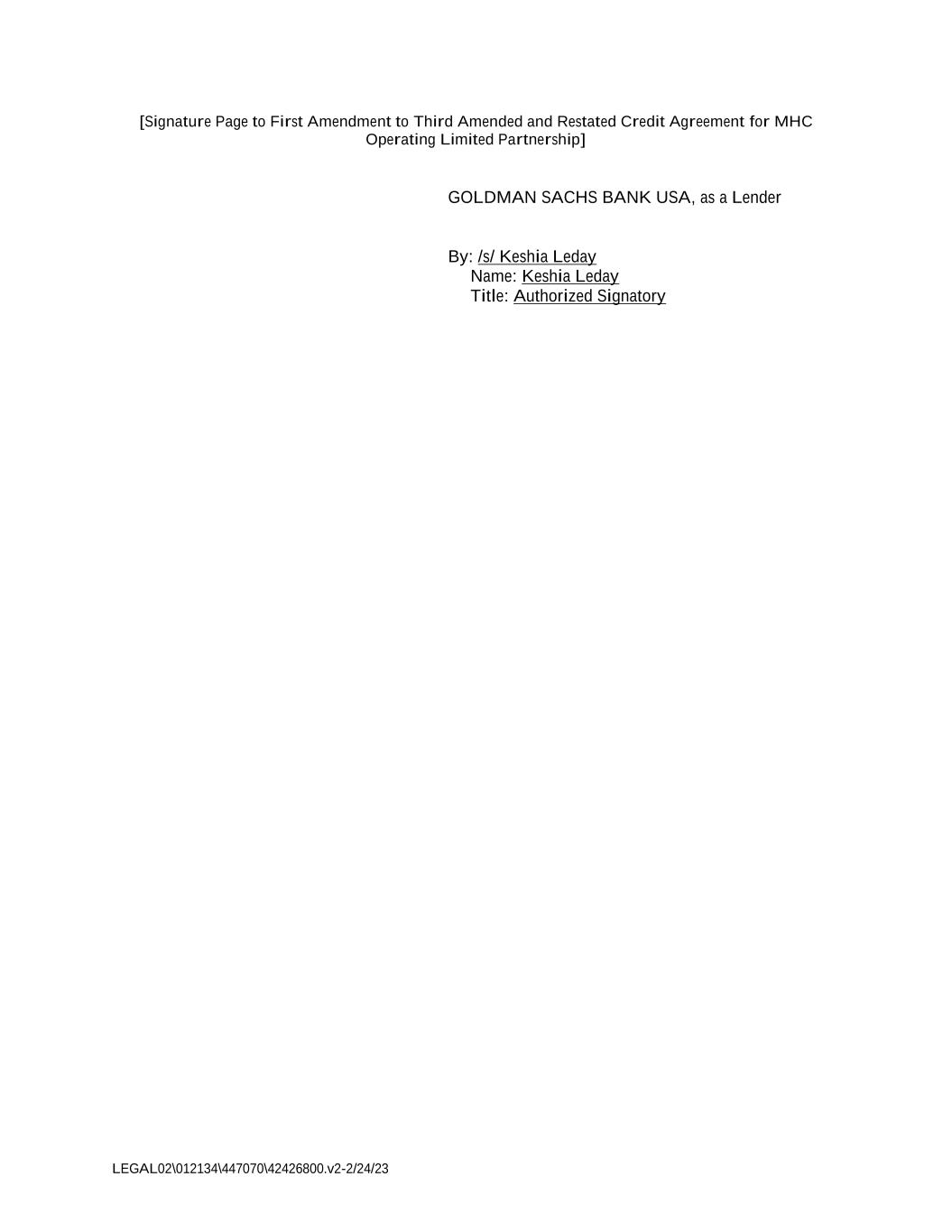 LEGAL02\012134\447070\42426800.v2-2/24/23 [Signature Page to First Amendment to Third Amended and Restated Credit Agreement for MHC Operating Limited Partnership] GOLDMAN SACHS BANK USA, as a Lender By: /s/ Keshia Leday Name: Keshia Leday Title: Authorized Signatory