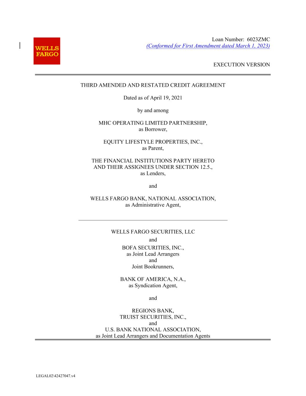 LEGAL02\42427047.v4 Loan Number: 6023ZMC (Conformed for First Amendment dated March 1, 2023) EXECUTION VERSION THIRD AMENDED AND RESTATED CREDIT AGREEMENT Dated as of April 19, 2021 by and among MHC OPERATING LIMITED PARTNERSHIP, as Borrower, EQUITY LIFESTYLE PROPERTIES, INC., as Parent, THE FINANCIAL INSTITUTIONS PARTY HERETO AND THEIR ASSIGNEES UNDER SECTION 12.5., as Lenders, and WELLS FARGO BANK, NATIONAL ASSOCIATION, as Administrative Agent, ______________________________________________________ WELLS FARGO SECURITIES, LLC and BOFA SECURITIES, INC., as Joint Lead Arrangers and Joint Bookrunners, BANK OF AMERICA, N.A., as Syndication Agent, and REGIONS BANK, TRUIST SECURITIES, INC., and U.S. BANK NATIONAL ASSOCIATION, as Joint Lead Arrangers and Documentation Agents