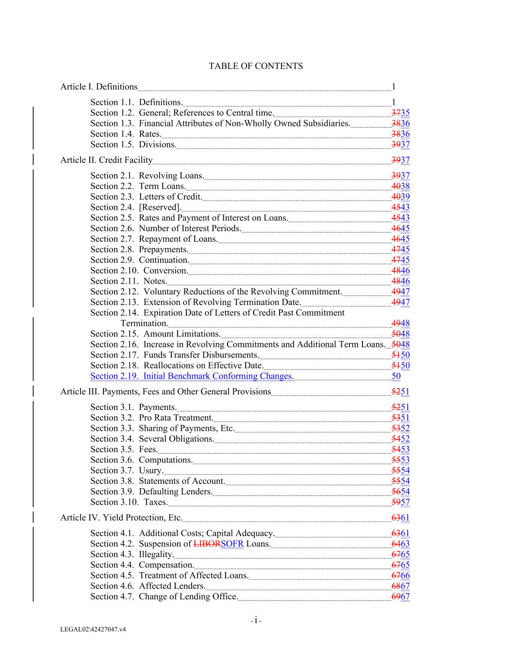 TABLE OF CONTENTS Article I. Definitions 1 Section 1.1. Definitions. 1 Section 1.2. General; References to Central time. 3735 Section 1.3. Financial Attributes of Non-Wholly Owned Subsidiaries. 3836 Section 1.4. Rates. 3836 Section 1.5. Divisions. 3937 Article II. Credit Facility 3937 Section 2.1. Revolving Loans. 3937 Section 2.2. Term Loans. 4038 Section 2.3. Letters of Credit. 4039 Section 2.4. [Reserved]. 4543 Section 2.5. Rates and Payment of Interest on Loans. 4543 Section 2.6. Number of Interest Periods. 4645 Section 2.7. Repayment of Loans. 4645 Section 2.8. Prepayments. 4745 Section 2.9. Continuation. 4745 Section 2.10. Conversion. 4846 Section 2.11. Notes. 4846 Section 2.12. Voluntary Reductions of the Revolving Commitment. 4947 Section 2.13. Extension of Revolving Termination Date. 4947 Section 2.14. Expiration Date of Letters of Credit Past Commitment Termination. 4948 Section 2.15. Amount Limitations. 5048 Section 2.16. Increase in Revolving Commitments and Additional Term Loans. 5048 Section 2.17. Funds Transfer Disbursements. 5150 Section 2.18. Reallocations on Effective Date. 5150 Section 2.19. Initial Benchmark Conforming Changes. 50 Article III. Payments, Fees and Other General Provisions 5251 Section 3.1. Payments. 5251 Section 3.2. Pro Rata Treatment. 5351 Section 3.3. Sharing of Payments, Etc. 5352 Section 3.4. Several Obligations. 5452 Section 3.5. Fees. 5453 Section 3.6. Computations. 5553 Section 3.7. Usury. 5554 Section 3.8. Statements of Account. 5554 Section 3.9. Defaulting Lenders. 5654 Section 3.10. Taxes. 5957 Article IV. Yield Protection, Etc. 6361 Section 4.1. Additional Costs; Capital Adequacy. 6361 Section 4.2. Suspension of LIBORSOFR Loans. 6463 Section 4.3. Illegality. 6765 Section 4.4. Compensation. 6765 Section 4.5. Treatment of Affected Loans. 6766 Section 4.6. Affected Lenders. 6867 Section 4.7. Change of Lending Office. 6967 - i - LEGAL02\42427047.v4