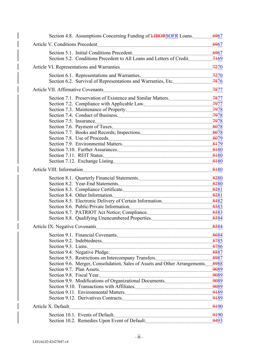 Section 4.8. Assumptions Concerning Funding of LIBORSOFR Loans. 6967 Article V. Conditions Precedent 6967 Section 5.1. Initial Conditions Precedent. 6967 Section 5.2. Conditions Precedent to All Loans and Letters of Credit. 7169 Article VI. Representations and Warranties 7270 Section 6.1. Representations and Warranties. 7270 Section 6.2. Survival of Representations and Warranties, Etc. 7876 Article VII. Affirmative Covenants 7877 Section 7.1. Preservation of Existence and Similar Matters. 7877 Section 7.2. Compliance with Applicable Law. 7977 Section 7.3. Maintenance of Property. 7978 Section 7.4. Conduct of Business. 7978 Section 7.5. Insurance. 7978 Section 7.6. Payment of Taxes. 8078 Section 7.7. Books and Records; Inspections. 8078 Section 7.8. Use of Proceeds. 8079 Section 7.9. Environmental Matters. 8179 Section 7.10. Further Assurances. 8180 Section 7.11. REIT Status. 8180 Section 7.12. Exchange Listing. 8180 Article VIII. Information 8180 Section 8.1. Quarterly Financial Statements. 8280 Section 8.2. Year-End Statements. 8280 Section 8.3. Compliance Certificate. 8281 Section 8.4. Other Information. 8281 Section 8.5. Electronic Delivery of Certain Information. 8482 Section 8.6. Public/Private Information. 8583 Section 8.7. PATRIOT Act Notice; Compliance. 8583 Section 8.8. Qualifying Unencumbered Properties. 8584 Article IX. Negative Covenants 8584 Section 9.1. Financial Covenants. 8684 Section 9.2. Indebtedness. 8785 Section 9.3. Liens. 8786 Section 9.4. Negative Pledge. 8887 Section 9.5. Restrictions on Intercompany Transfers. 8987 Section 9.6. Merger, Consolidation, Sales of Assets and Other Arrangements. 8988 Section 9.7. Plan Assets. 9089 Section 9.8. Fiscal Year. 9089 Section 9.9. Modifications of Organizational Documents. 9089 Section 9.10. Transactions with Affiliates. 9089 Section 9.11. Environmental Matters. 9189 Section 9.12. Derivatives Contracts. 9189 Article X. Default 9190 Section 10.1. Events of Default. 9190 Section 10.2. Remedies Upon Event of Default. 9493 - ii - LEGAL02\42427047.v4