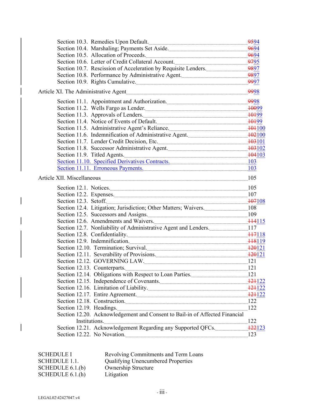 Section 10.3. Remedies Upon Default. 9594 Section 10.4. Marshaling; Payments Set Aside. 9694 Section 10.5. Allocation of Proceeds. 9694 Section 10.6. Letter of Credit Collateral Account. 9795 Section 10.7. Rescission of Acceleration by Requisite Lenders. 9897 Section 10.8. Performance by Administrative Agent. 9897 Section 10.9. Rights Cumulative. 9997 Article XI. The Administrative Agent 9998 Section 11.1. Appointment and Authorization. 9998 Section 11.2. Wells Fargo as Lender. 10099 Section 11.3. Approvals of Lenders. 10199 Section 11.4. Notice of Events of Default. 10199 Section 11.5. Administrative Agent’s Reliance. 101100 Section 11.6. Indemnification of Administrative Agent. 102100 Section 11.7. Lender Credit Decision, Etc. 103101 Section 11.8. Successor Administrative Agent. 103102 Section 11.9. Titled Agents. 104103 Section 11.10. Specified Derivatives Contracts. 103 Section 11.11. Erroneous Payments. 103 Article XII. Miscellaneous 105 Section 12.1. Notices. 105 Section 12.2. Expenses. 107 Section 12.3. Setoff. 107108 Section 12.4. Litigation; Jurisdiction; Other Matters; Waivers. 108 Section 12.5. Successors and Assigns. 109 Section 12.6. Amendments and Waivers. 114115 Section 12.7. Nonliability of Administrative Agent and Lenders. 117 Section 12.8. Confidentiality. 117118 Section 12.9. Indemnification. 118119 Section 12.10. Termination; Survival. 120121 Section 12.11. Severability of Provisions. 120121 Section 12.12. GOVERNING LAW. 121 Section 12.13. Counterparts. 121 Section 12.14. Obligations with Respect to Loan Parties. 121 Section 12.15. Independence of Covenants. 121122 Section 12.16. Limitation of Liability. 121122 Section 12.17. Entire Agreement. 121122 Section 12.18. Construction. 122 Section 12.19. Headings. 122 Section 12.20. Acknowledgement and Consent to Bail-in of Affected Financial Institutions. 122 Section 12.21. Acknowledgement Regarding any Supported QFCs. 122123 Section 12.22. No Novation. 123 SCHEDULE I Revolving Commitments and Term Loans SCHEDULE 1.1. Qualifying Unencumbered Properties SCHEDULE 6.1.(b) Ownership Structure SCHEDULE 6.1.(h) Litigation - iii - LEGAL02\42427047.v4