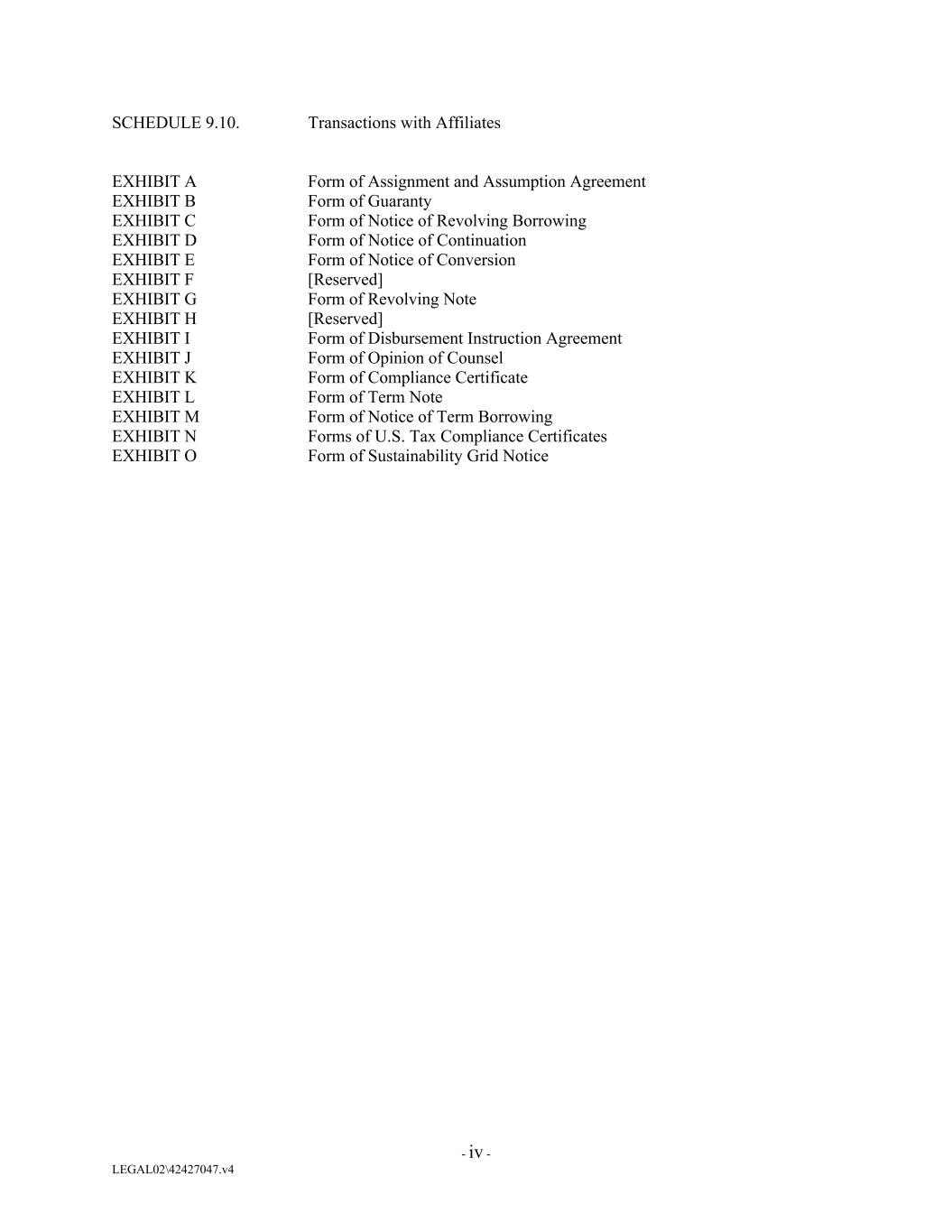 SCHEDULE 9.10. Transactions with Affiliates EXHIBIT A Form of Assignment and Assumption Agreement EXHIBIT B Form of Guaranty EXHIBIT C Form of Notice of Revolving Borrowing EXHIBIT D Form of Notice of Continuation EXHIBIT E Form of Notice of Conversion EXHIBIT F [Reserved] EXHIBIT G Form of Revolving Note EXHIBIT H [Reserved] EXHIBIT I Form of Disbursement Instruction Agreement EXHIBIT J Form of Opinion of Counsel EXHIBIT K Form of Compliance Certificate EXHIBIT L Form of Term Note EXHIBIT M Form of Notice of Term Borrowing EXHIBIT N Forms of U.S. Tax Compliance Certificates EXHIBIT O Form of Sustainability Grid Notice - iv - LEGAL02\42427047.v4