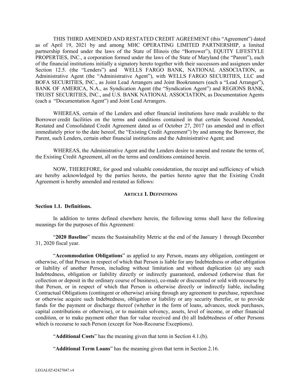 THIS THIRD AMENDED AND RESTATED CREDIT AGREEMENT (this “Agreement”) dated as of April 19, 2021 by and among MHC OPERATING LIMITED PARTNERSHIP, a limited partnership formed under the laws of the State of Illinois (the “Borrower”), EQUITY LIFESTYLE PROPERTIES, INC., a corporation formed under the laws of the State of Maryland (the “Parent”), each of the financial institutions initially a signatory hereto together with their successors and assignees under Section 12.5. (the “Lenders”) and WELLS FARGO BANK, NATIONAL ASSOCIATION, as Administrative Agent (the “Administrative Agent”), with WELLS FARGO SECURITIES, LLC and BOFA SECURITIES, INC., as Joint Lead Arrangers and Joint Bookrunners (each a “Lead Arranger”), BANK OF AMERICA, N.A., as Syndication Agent (the “Syndication Agent”) and REGIONS BANK, TRUIST SECURITIES, INC., and U.S. BANK NATIONAL ASSOCIATION, as Documentation Agents (each a “Documentation Agent”) and Joint Lead Arrangers. WHEREAS, certain of the Lenders and other financial institutions have made available to the Borrower credit facilities on the terms and conditions contained in that certain Second Amended, Restated and Consolidated Credit Agreement dated as of October 27, 2017 (as amended and in effect immediately prior to the date hereof, the “Existing Credit Agreement”) by and among the Borrower, the Parent, such Lenders, certain other financial institutions and the Administrative Agent; and WHEREAS, the Administrative Agent and the Lenders desire to amend and restate the terms of, the Existing Credit Agreement, all on the terms and conditions contained herein. NOW, THEREFORE, for good and valuable consideration, the receipt and sufficiency of which are hereby acknowledged by the parties hereto, the parties hereto agree that the Existing Credit Agreement is hereby amended and restated as follows: ARTICLE I. DEFINITIONS Section 1.1. Definitions. In addition to terms defined elsewhere herein, the following terms shall have the following meanings for the purposes of this Agreement: “2020 Baseline” means the Sustainability Metric at the end of the January 1 through December 31, 2020 fiscal year. “Accommodation Obligations” as applied to any Person, means any obligation, contingent or otherwise, of that Person in respect of which that Person is liable for any Indebtedness or other obligation or liability of another Person, including without limitation and without duplication (a) any such Indebtedness, obligation or liability directly or indirectly guaranteed, endorsed (otherwise than for collection or deposit in the ordinary course of business), co-made or discounted or sold with recourse by that Person, or in respect of which that Person is otherwise directly or indirectly liable, including Contractual Obligations (contingent or otherwise) arising through any agreement to purchase, repurchase or otherwise acquire such Indebtedness, obligation or liability or any security therefor, or to provide funds for the payment or discharge thereof (whether in the form of loans, advances, stock purchases, capital contributions or otherwise), or to maintain solvency, assets, level of income, or other financial condition, or to make payment other than for value received and (b) all Indebtedness of other Persons which is recourse to such Person (except for Non-Recourse Exceptions). “Additional Costs” has the meaning given that term in Section 4.1.(b). “Additional Term Loans” has the meaning given that term in Section 2.16. LEGAL02\42427047.v4