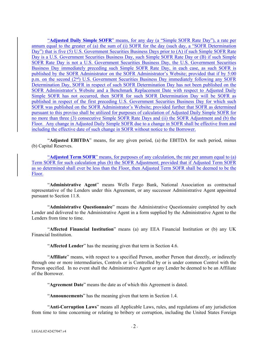 “Adjusted Daily Simple SOFR” means, for any day (a “Simple SOFR Rate Day”), a rate per annum equal to the greater of (a) the sum of (i) SOFR for the day (such day, a “SOFR Determination Day”) that is five (5) U.S. Government Securities Business Days prior to (A) if such Simple SOFR Rate Day is a U.S. Government Securities Business Day, such Simple SOFR Rate Day or (B) if such Simple SOFR Rate Day is not a U.S. Government Securities Business Day, the U.S. Government Securities Business Day immediately preceding such Simple SOFR Rate Day, in each case, as such SOFR is published by the SOFR Administrator on the SOFR Administrator’s Website; provided that if by 5:00 p.m. on the second (2nd) U.S. Government Securities Business Day immediately following any SOFR Determination Day, SOFR in respect of such SOFR Determination Day has not been published on the SOFR Administrator’s Website and a Benchmark Replacement Date with respect to Adjusted Daily Simple SOFR has not occurred, then SOFR for such SOFR Determination Day will be SOFR as published in respect of the first preceding U.S. Government Securities Business Day for which such SOFR was published on the SOFR Administrator’s Website; provided further that SOFR as determined pursuant to this proviso shall be utilized for purposes of calculation of Adjusted Daily Simple SOFR for no more than three (3) consecutive Simple SOFR Rate Days and (ii) the SOFR Adjustment and (b) the Floor. Any change in Adjusted Daily Simple SOFR due to a change in SOFR shall be effective from and including the effective date of such change in SOFR without notice to the Borrower. “Adjusted EBITDA” means, for any given period, (a) the EBITDA for such period, minus (b) Capital Reserves. “Adjusted Term SOFR” means, for purposes of any calculation, the rate per annum equal to (a) Term SOFR for such calculation plus (b) the SOFR Adjustment; provided that if Adjusted Term SOFR as so determined shall ever be less than the Floor, then Adjusted Term SOFR shall be deemed to be the Floor. “Administrative Agent” means Wells Fargo Bank, National Association as contractual representative of the Lenders under this Agreement, or any successor Administrative Agent appointed pursuant to Section 11.8. “Administrative Questionnaire” means the Administrative Questionnaire completed by each Lender and delivered to the Administrative Agent in a form supplied by the Administrative Agent to the Lenders from time to time. “Affected Financial Institution” means (a) any EEA Financial Institution or (b) any UK Financial Institution. “Affected Lender” has the meaning given that term in Section 4.6. “Affiliate” means, with respect to a specified Person, another Person that directly, or indirectly through one or more intermediaries, Controls or is Controlled by or is under common Control with the Person specified. In no event shall the Administrative Agent or any Lender be deemed to be an Affiliate of the Borrower. “Agreement Date” means the date as of which this Agreement is dated. “Announcements” has the meaning given that term in Section 1.4. “Anti-Corruption Laws” means all Applicable Laws, rules, and regulations of any jurisdiction from time to time concerning or relating to bribery or corruption, including the United States Foreign - 2 - LEGAL02\42427047.v4