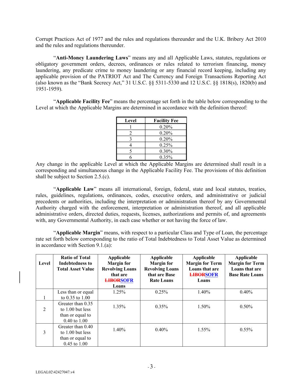 - 3 - LEGAL02\42427047.v4 Ratio of Total Indebtedness to Total Asset Value 3 Applicable Margin for Revolving Loans that are LIBORSOFR Loans Applicable Margin for Revolving Loans that are Base Rate Loans 0.20% Applicable Margin for Term Loans that are LIBORSOFR Loans 1 Applicable Margin for Term Loans that are Base Rate Loans 1 4 Less than or equal to 0.35 to 1.00 0.20% 1.25% 0.25% 0.25% Level 1.40% 0.40% 5 2 Greater than 0.35 to 1.00 but less than or equal to 0.40 to 1.00 0.30% 1.35% 2 0.35% 1.50% Facility Fee 0.50% 6 0.20% 3 0.35% Greater than 0.40 to 1.00 but less than or equal to 0.45 to 1.00 Corrupt Practices Act of 1977 and the rules and regulations thereunder and the U.K. Bribery Act 2010 and the rules and regulations thereunder. “Anti-Money Laundering Laws” means any and all Applicable Laws, statutes, regulations or obligatory government orders, decrees, ordinances or rules related to terrorism financing, money laundering, any predicate crime to money laundering or any financial record keeping, including any applicable provision of the PATRIOT Act and The Currency and Foreign Transactions Reporting Act (also known as the “Bank Secrecy Act,” 31 U.S.C. §§ 5311-5330 and 12 U.S.C. §§ 1818(s), 1820(b) and 1951-1959). “Applicable Facility Fee” means the percentage set forth in the table below corresponding to the Level at which the Applicable Margins are determined in accordance with the definition thereof: 1.40% Any change in the applicable Level at which the Applicable Margins are determined shall result in a corresponding and simultaneous change in the Applicable Facility Fee. The provisions of this definition shall be subject to Section 2.5.(c). “Applicable Law” means all international, foreign, federal, state and local statutes, treaties, rules, guidelines, regulations, ordinances, codes, executive orders, and administrative or judicial precedents or authorities, including the interpretation or administration thereof by any Governmental Authority charged with the enforcement, interpretation or administration thereof, and all applicable administrative orders, directed duties, requests, licenses, authorizations and permits of, and agreements with, any Governmental Authority, in each case whether or not having the force of law. “Applicable Margin” means, with respect to a particular Class and Type of Loan, the percentage rate set forth below corresponding to the ratio of Total Indebtedness to Total Asset Value as determined in accordance with Section 9.1.(a): 0.40% 1.55% 0.55% Level