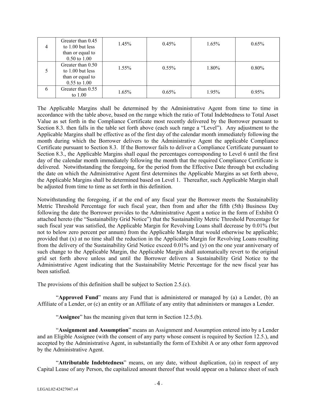 - 4 - LEGAL02\42427047.v4 1.55% 0.45% 0.55% 4 1.80% 1.65% 0.80% 0.65% 6 Greater than 0.45 to 1.00 but less than or equal to 0.50 to 1.00 Greater than 0.55 to 1.00 1.65% 0.65% 5 1.95% 1.45% 0.95% Greater than 0.50 to 1.00 but less than or equal to 0.55 to 1.00 The Applicable Margins shall be determined by the Administrative Agent from time to time in accordance with the table above, based on the range which the ratio of Total Indebtedness to Total Asset Value as set forth in the Compliance Certificate most recently delivered by the Borrower pursuant to Section 8.3. then falls in the table set forth above (each such range a “Level”). Any adjustment to the Applicable Margins shall be effective as of the first day of the calendar month immediately following the month during which the Borrower delivers to the Administrative Agent the applicable Compliance Certificate pursuant to Section 8.3. If the Borrower fails to deliver a Compliance Certificate pursuant to Section 8.3., the Applicable Margins shall equal the percentages corresponding to Level 6 until the first day of the calendar month immediately following the month that the required Compliance Certificate is delivered. Notwithstanding the foregoing, for the period from the Effective Date through but excluding the date on which the Administrative Agent first determines the Applicable Margins as set forth above, the Applicable Margins shall be determined based on Level 1. Thereafter, such Applicable Margin shall be adjusted from time to time as set forth in this definition. Notwithstanding the foregoing, if at the end of any fiscal year the Borrower meets the Sustainability Metric Threshold Percentage for such fiscal year, then from and after the fifth (5th) Business Day following the date the Borrower provides to the Administrative Agent a notice in the form of Exhibit O attached hereto (the “Sustainability Grid Notice”) that the Sustainability Metric Threshold Percentage for such fiscal year was satisfied, the Applicable Margin for Revolving Loans shall decrease by 0.01% (but not to below zero percent per annum) from the Applicable Margin that would otherwise be applicable; provided that (x) at no time shall the reduction in the Applicable Margin for Revolving Loans resulting from the delivery of the Sustainability Grid Notice exceed 0.01% and (y) on the one year anniversary of such change to the Applicable Margin, the Applicable Margin shall automatically revert to the original grid set forth above unless and until the Borrower delivers a Sustainability Grid Notice to the Administrative Agent indicating that the Sustainability Metric Percentage for the new fiscal year has been satisfied. The provisions of this definition shall be subject to Section 2.5.(c). “Approved Fund” means any Fund that is administered or managed by (a) a Lender, (b) an Affiliate of a Lender, or (c) an entity or an Affiliate of any entity that administers or manages a Lender. “Assignee” has the meaning given that term in Section 12.5.(b). “Assignment and Assumption” means an Assignment and Assumption entered into by a Lender and an Eligible Assignee (with the consent of any party whose consent is required by Section 12.5.), and accepted by the Administrative Agent, in substantially the form of Exhibit A or any other form approved by the Administrative Agent. “Attributable Indebtedness” means, on any date, without duplication, (a) in respect of any Capital Lease of any Person, the capitalized amount thereof that would appear on a balance sheet of such