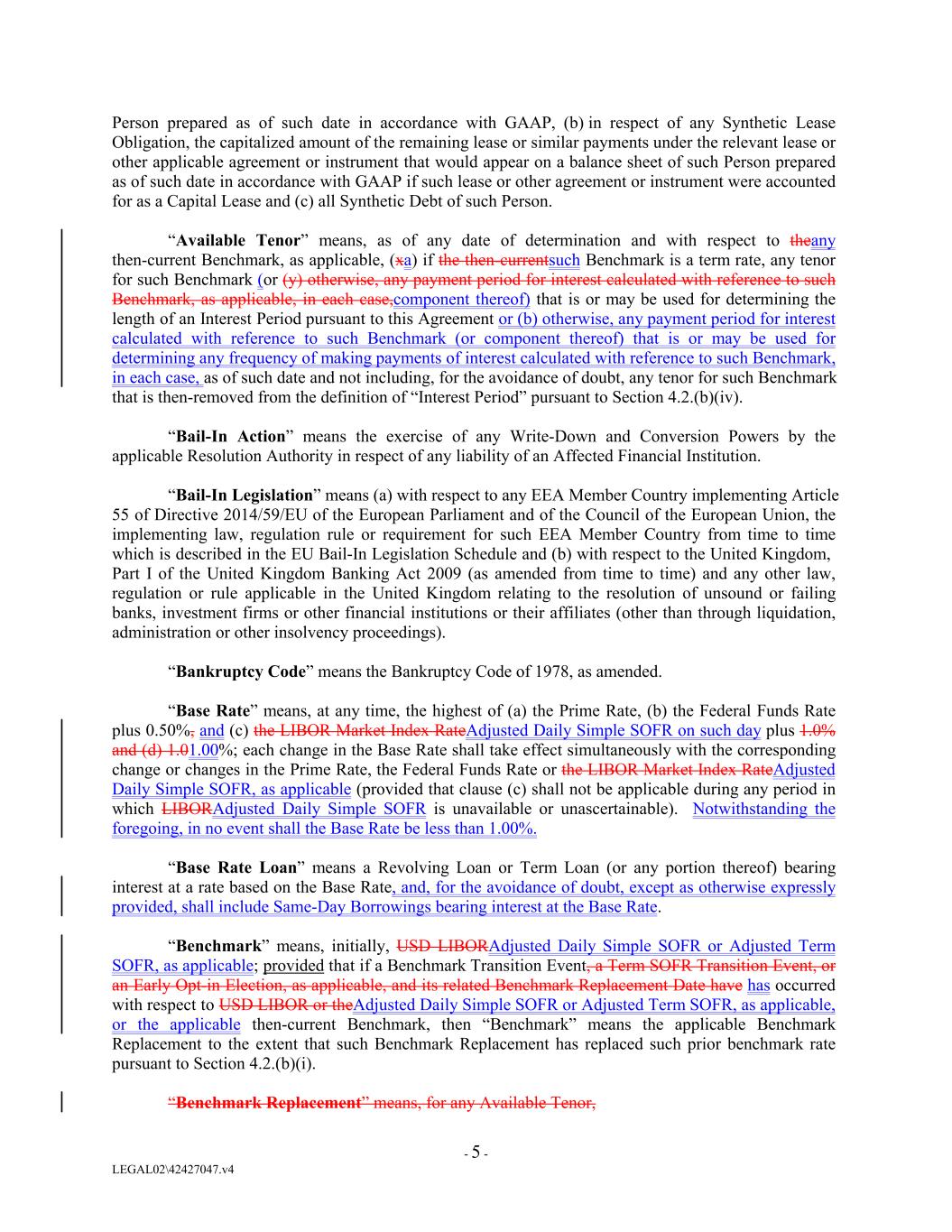 Person prepared as of such date in accordance with GAAP, (b) in respect of any Synthetic Lease Obligation, the capitalized amount of the remaining lease or similar payments under the relevant lease or other applicable agreement or instrument that would appear on a balance sheet of such Person prepared as of such date in accordance with GAAP if such lease or other agreement or instrument were accounted for as a Capital Lease and (c) all Synthetic Debt of such Person. “Available Tenor” means, as of any date of determination and with respect to theany then-current Benchmark, as applicable, (xa) if the then-currentsuch Benchmark is a term rate, any tenor for such Benchmark (or (y) otherwise, any payment period for interest calculated with reference to such Benchmark, as applicable, in each case,component thereof) that is or may be used for determining the length of an Interest Period pursuant to this Agreement or (b) otherwise, any payment period for interest calculated with reference to such Benchmark (or component thereof) that is or may be used for determining any frequency of making payments of interest calculated with reference to such Benchmark, in each case, as of such date and not including, for the avoidance of doubt, any tenor for such Benchmark that is then-removed from the definition of “Interest Period” pursuant to Section 4.2.(b)(iv). “Bail-In Action” means the exercise of any Write-Down and Conversion Powers by the applicable Resolution Authority in respect of any liability of an Affected Financial Institution. “Bail-In Legislation” means (a) with respect to any EEA Member Country implementing Article 55 of Directive 2014/59/EU of the European Parliament and of the Council of the European Union, the implementing law, regulation rule or requirement for such EEA Member Country from time to time which is described in the EU Bail-In Legislation Schedule and (b) with respect to the United Kingdom, Part I of the United Kingdom Banking Act 2009 (as amended from time to time) and any other law, regulation or rule applicable in the United Kingdom relating to the resolution of unsound or failing banks, investment firms or other financial institutions or their affiliates (other than through liquidation, administration or other insolvency proceedings). “Bankruptcy Code” means the Bankruptcy Code of 1978, as amended. “Base Rate” means, at any time, the highest of (a) the Prime Rate, (b) the Federal Funds Rate plus 0.50%, and (c) the LIBOR Market Index RateAdjusted Daily Simple SOFR on such day plus 1.0% and (d) 1.01.00%; each change in the Base Rate shall take effect simultaneously with the corresponding change or changes in the Prime Rate, the Federal Funds Rate or the LIBOR Market Index RateAdjusted Daily Simple SOFR, as applicable (provided that clause (c) shall not be applicable during any period in which LIBORAdjusted Daily Simple SOFR is unavailable or unascertainable). Notwithstanding the foregoing, in no event shall the Base Rate be less than 1.00%. “Base Rate Loan” means a Revolving Loan or Term Loan (or any portion thereof) bearing interest at a rate based on the Base Rate, and, for the avoidance of doubt, except as otherwise expressly provided, shall include Same-Day Borrowings bearing interest at the Base Rate. “Benchmark” means, initially, USD LIBORAdjusted Daily Simple SOFR or Adjusted Term SOFR, as applicable; provided that if a Benchmark Transition Event, a Term SOFR Transition Event, or an Early Opt-in Election, as applicable, and its related Benchmark Replacement Date have has occurred with respect to USD LIBOR or theAdjusted Daily Simple SOFR or Adjusted Term SOFR, as applicable, or the applicable then-current Benchmark, then “Benchmark” means the applicable Benchmark Replacement to the extent that such Benchmark Replacement has replaced such prior benchmark rate pursuant to Section 4.2.(b)(i). “Benchmark Replacement” means, for any Available Tenor, - 5 - LEGAL02\42427047.v4